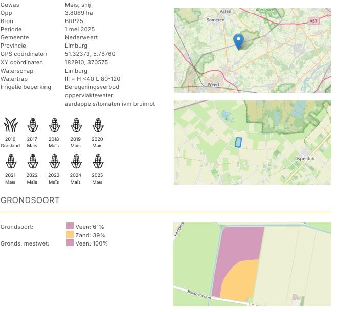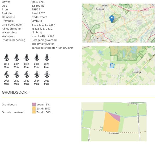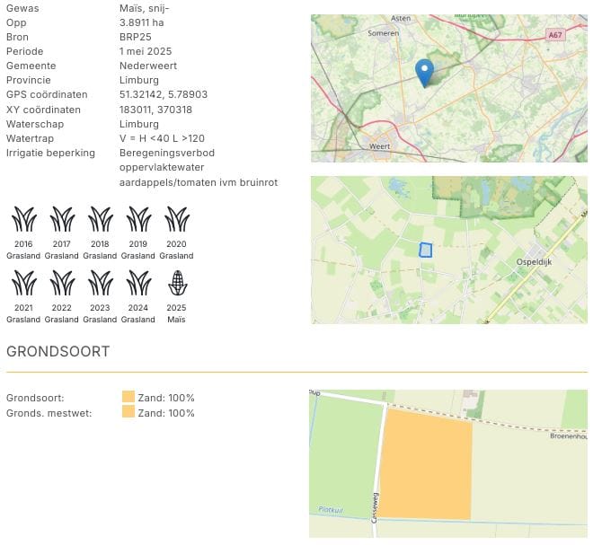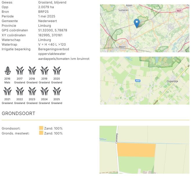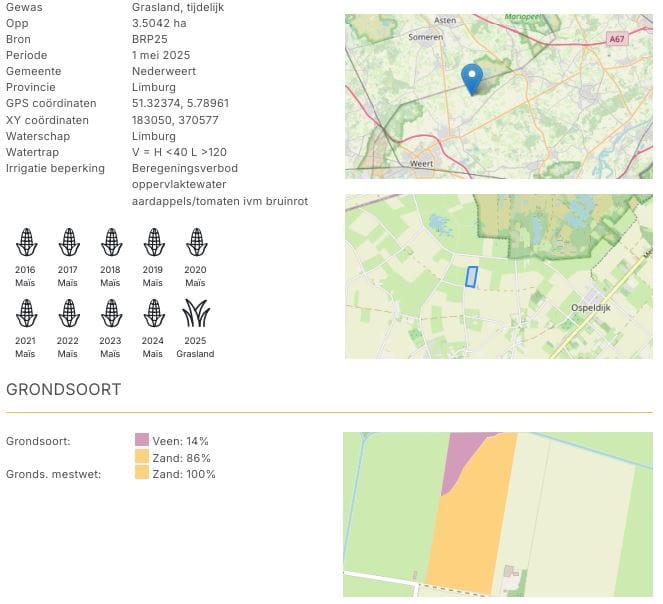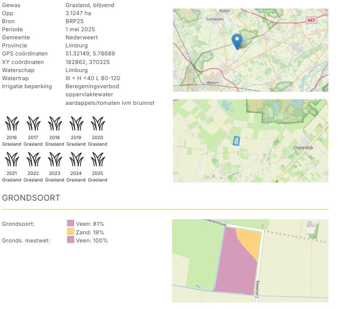 Het perceel is kadastraal bekend als gemeente Nederweert, sectie N, nummers 223, 224, 236, 238, 245, 310, 619, 620, 630 en 631, tezamen ter grootte van 23.33.10 hectare.