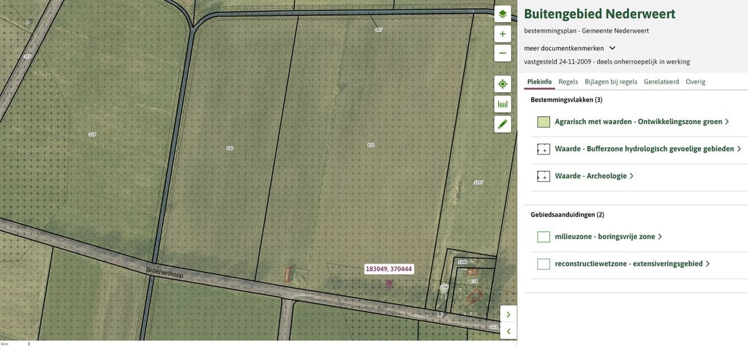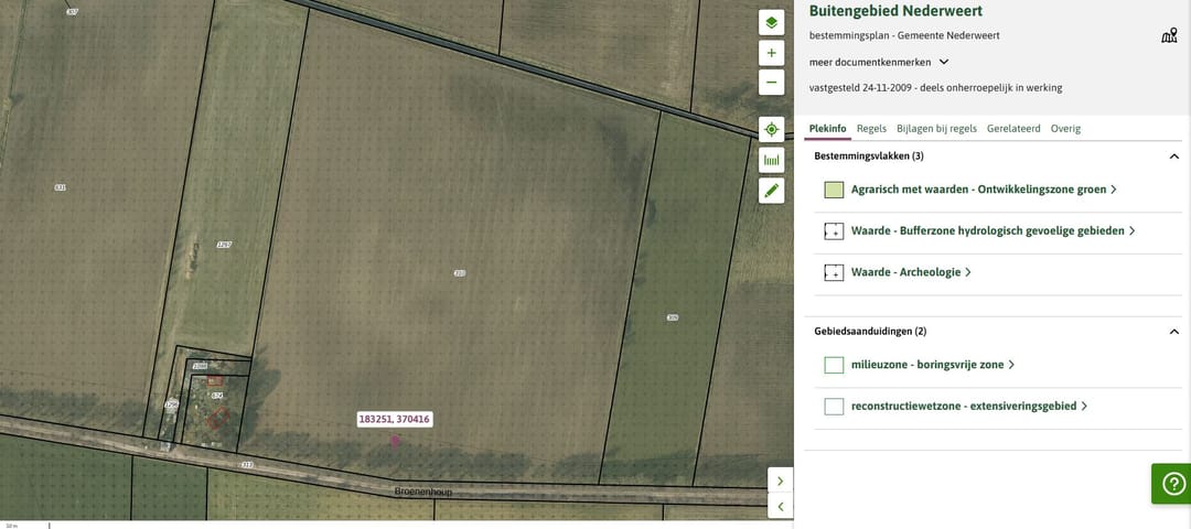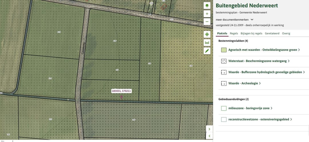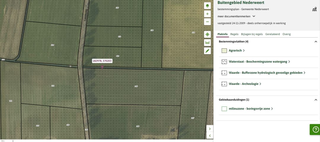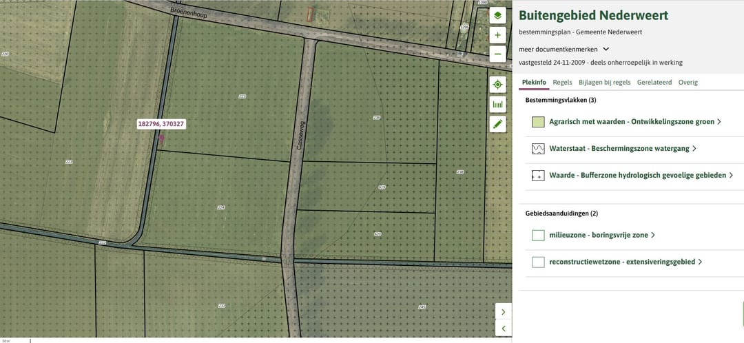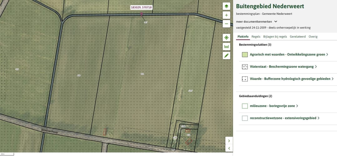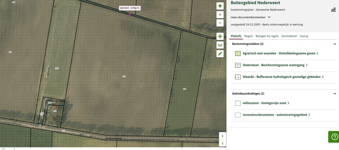 Het perceel is gelegen in het bestemmingsplan 'Buitengebied Nederweert' van de gemeente Nederweert Binnen dit bestemmingsplan heeft het perceel de enkelbestemming 'Agrarisch' en 'Agrarisch met waarden - Ontwikkelingszone groen' en de dubbelbestemming 'Waarde - Archeologie', 'Waarde - Beschermingszone watergang' en 'Waarde - Bufferzone hydrologisch gevoelige gebieden'.