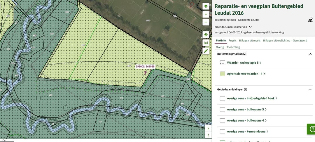 Het perceel is gelegen in het bestemmingsplan 'Reparatie- en veegplan Buitengebied Leudal 2016' van de gemeente Leudal. Binnen dit bestemmingsplan heeft het perceel de enkelbestemming 'Agrarisch met waarden - 4' en de dubbelbestemming 'Waarde - Archeologie 5'.
