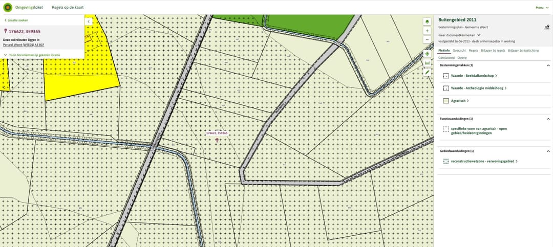 Het perceel is gelegen in het bestemmingsplan 'Buitengebied 2011' van de gemeente Weert. Binnen dit bestemmingsplan heeft het perceel de enkelbestemming 'Agrarisch'', deels de dubbelbestemming 'Waarde - Archeologie middelhoog' en 'Waarde - Beekdallandschap', functieaanduiding 'Specifieke vorm van agrarisch - open gebied/ heideontginningen' en de gebiedsaanduiding 'Reconstructiewetzone - verwevingsgebied'.