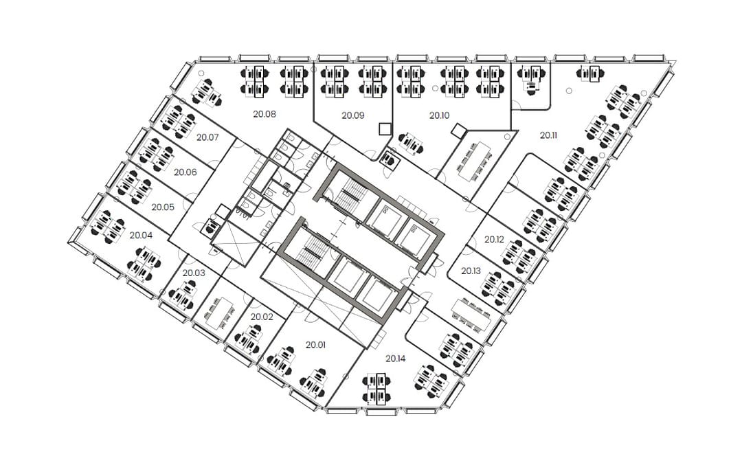 - 20e verdieping: circa 1.250 m² met privékantoren en gedeelde faciliteiten.