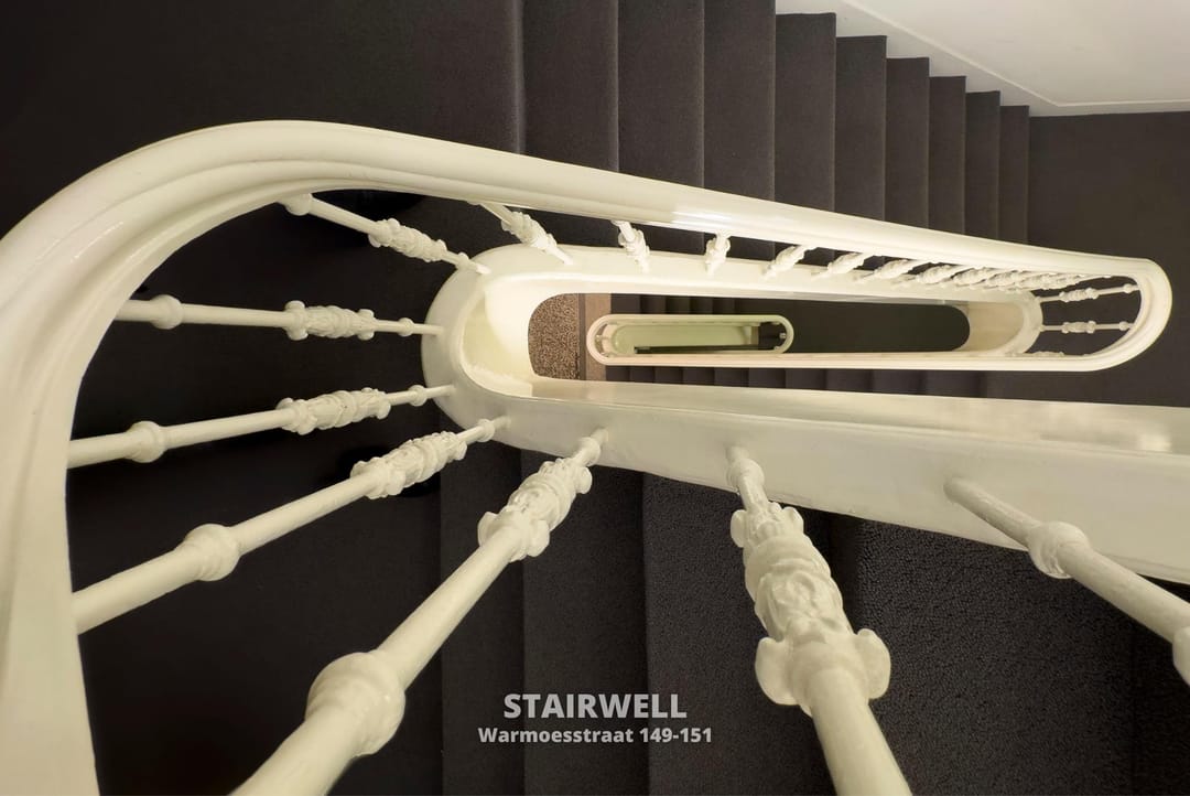 Op de plaats van Warmoesstraat 149 en 151 stonden ooit twee koopmanshuizen. De heren Ellerman & Harms van de gelijknamige drukkerij lieten de panden eind 19e eeuw afbreken om hun imposante hoofdkantoor hier te laten bouwen in de stijl van die tijd. De entree met grote houten deur, granito trappen en gewelfd plafond laten dit nog steeds zien. Het pand heeft een souterrain en 3 etages. Nummer 149-151 is binnendoor verbonden met Warmoesstraat 153.
