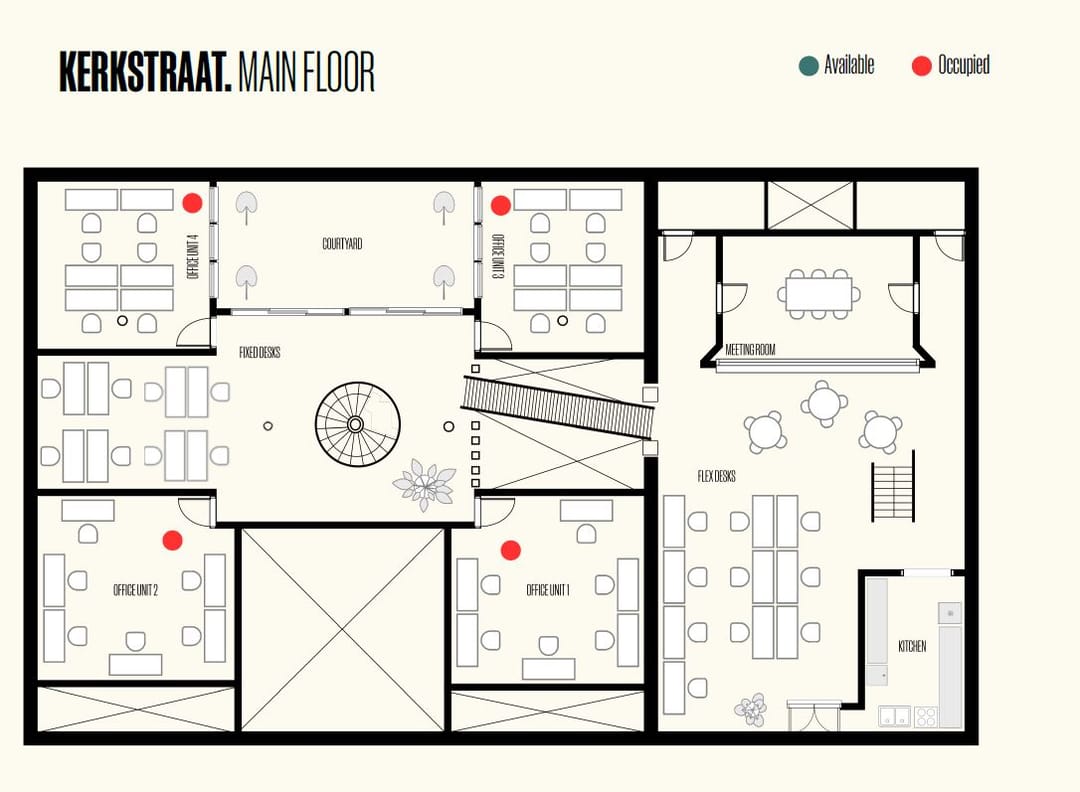 Gelegen in het hart van Amsterdam, biedt Kerkstraat 204 een inspirerende ruimte waar de charme van traditioneel Nederlands design samenkomt met moderne esthetiek. Grote ramen laten een overvloed aan natuurlijk licht binnenstromen, terwijl strakke interieurs en zorgvuldig samengestelde werkplekken zowel creativiteit als productiviteit bevorderen. Of je nu ondernemer, freelancer of onderdeel bent van een groeiende startup, Kerkstraat biedt een dynamische en flexibele werkomgeving die zich aanpast aan jouw behoeften.