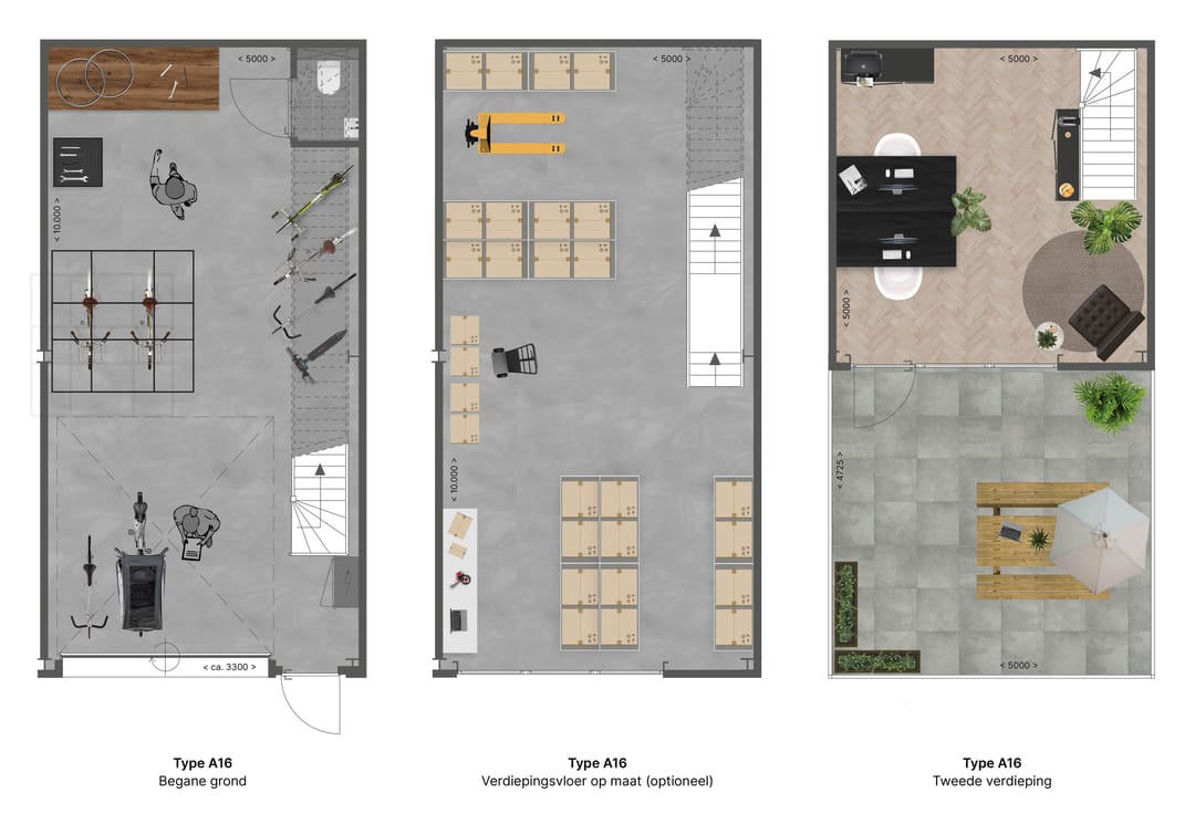 De genoemde vierkante meters hebben betrekking op de begane grondvloer. Maar wist u dat de units een vrije hoogte hebben van maar liefst 8 meter? Hierdoor heeft u alle vrijheid om direct na aankoop, of later wanneer u meer ruimte nodig heeft, een hele, halve of kwartverdieping toe te voegen. Zo kunt u de gebruiksoppervlakte eenvoudig verdubbelen.