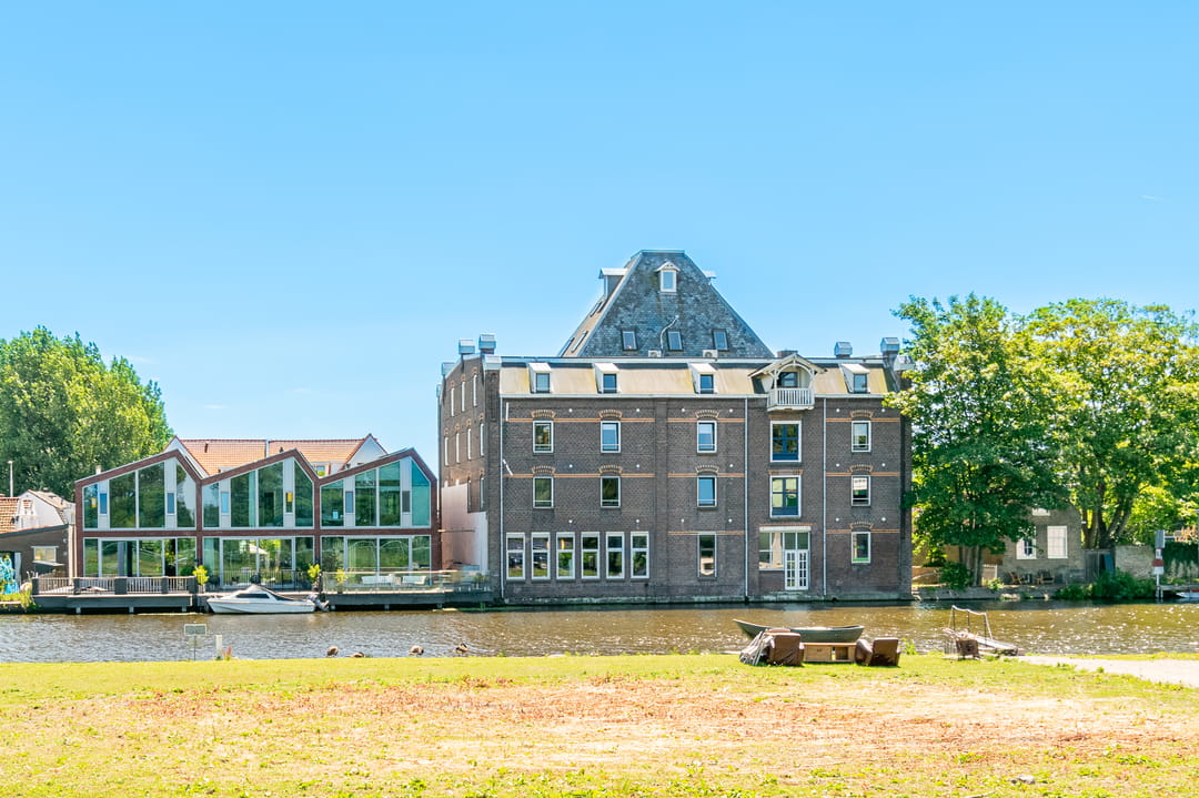 Een onderscheidend aspect is de ligging aan het water: de achterzijde van het gebouw grenst direct aan de Schie, wat zorgt voor een prettige en inspirerende werkomgeving. Op het afsluitbare binnenterrein bevinden zich een overdekte fietsenstalling en een picknicktafel, ideaal voor een informele pauze.
