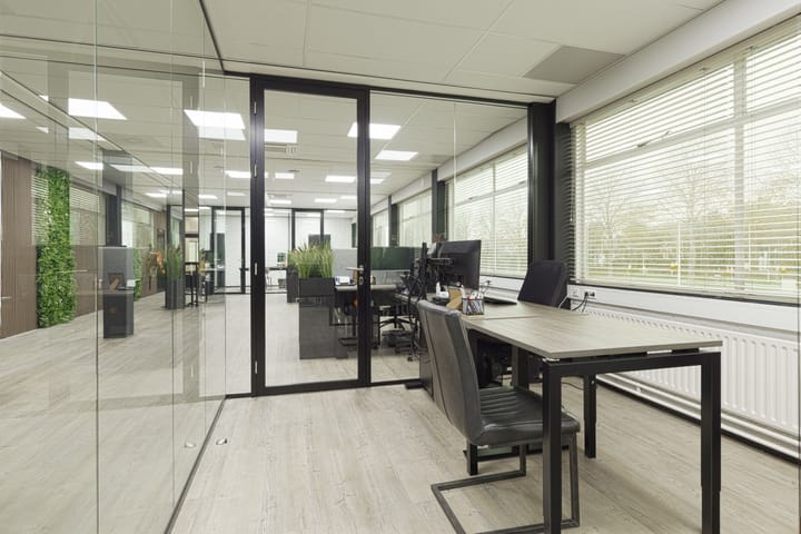 Via de entree bereikt u het kantoorgebouw. De begane grond bestaat uit meerdere aan elkaar verbonden kantoorruimtes en is voorzien van een toiletgroep en keuken.