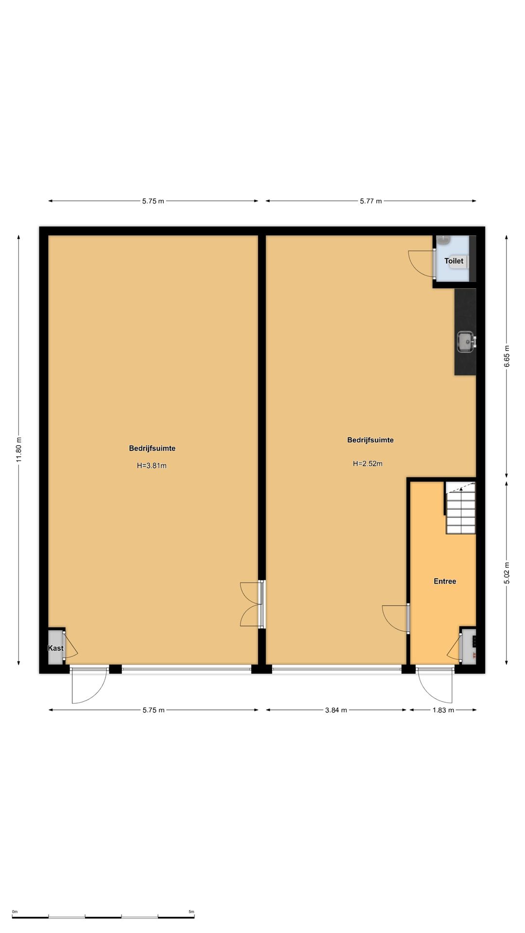 - Vrije hoogte bedrijfsruimte: ca. 3.80 meter.