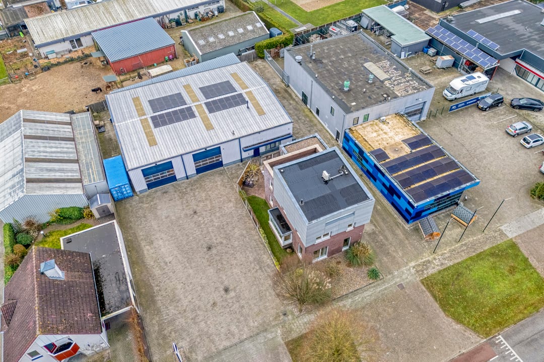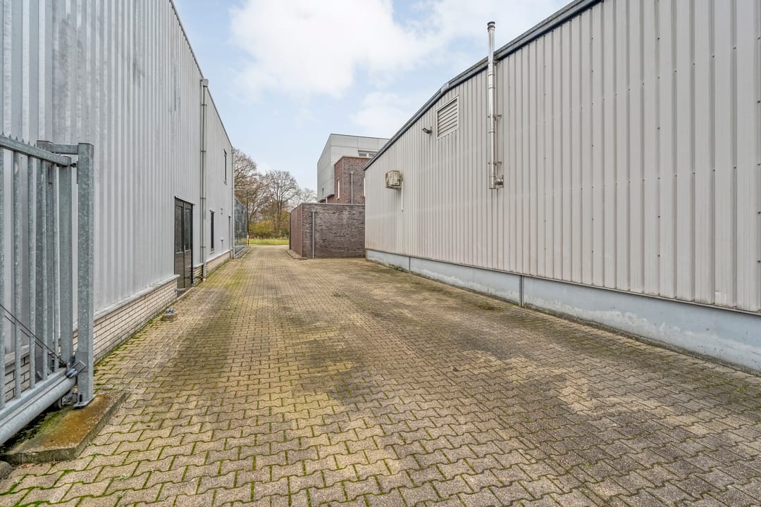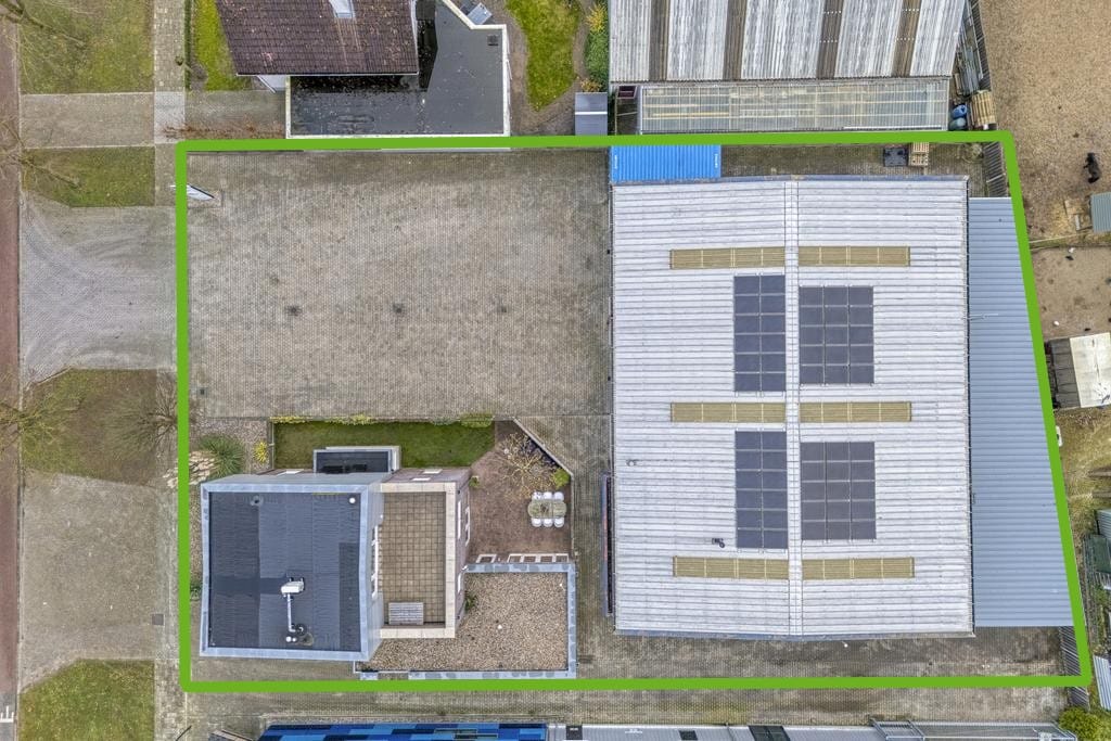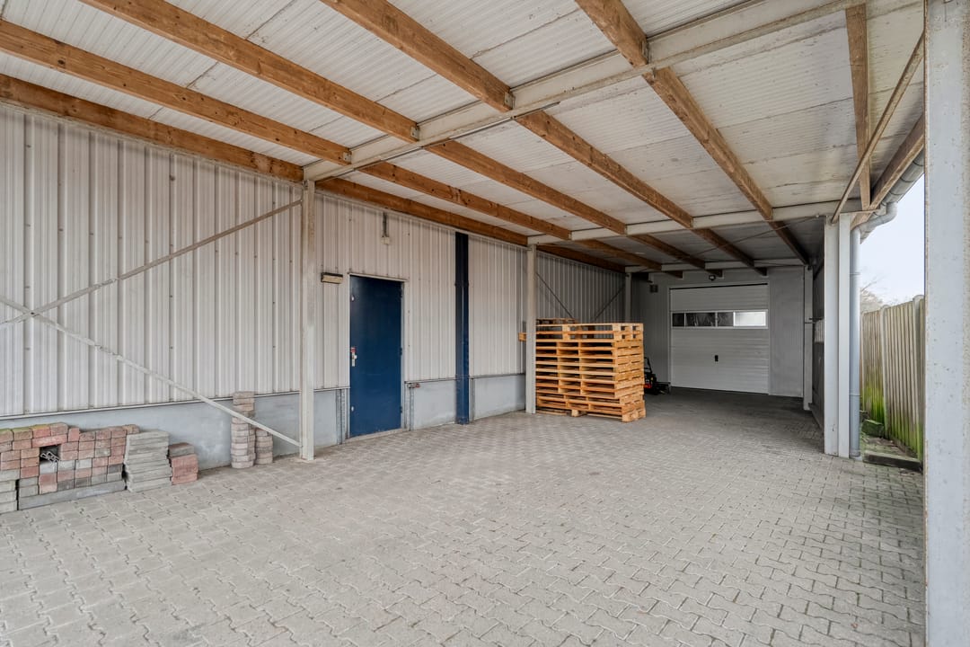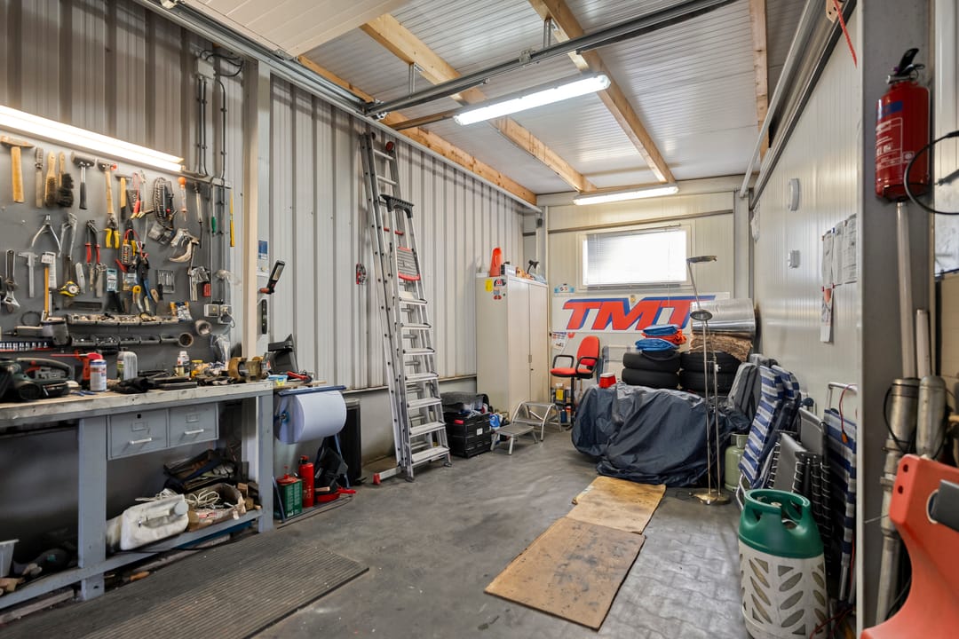 Naast de woning beschikt het object over een royaal buitenterrein en een grote geïsoleerde bedrijfsruimte. De bedrijfsruimte is voorzien van zonnepanelen en twee overheaddeuren, waardoor deze uitstekend toegankelijk is als opslaglocatie of werkplaats. Via een vaste trap is de entresol te bereiken. Onder de entresol bevinden zich een kantoorruimte, toiletruimte en stookruimte met opstelplaats voor de CV-installatie. Via de zijkant van het pand bereik je de achtergelegen overkapping met garage. De garage is tevens voorzien van een overheaddeur.