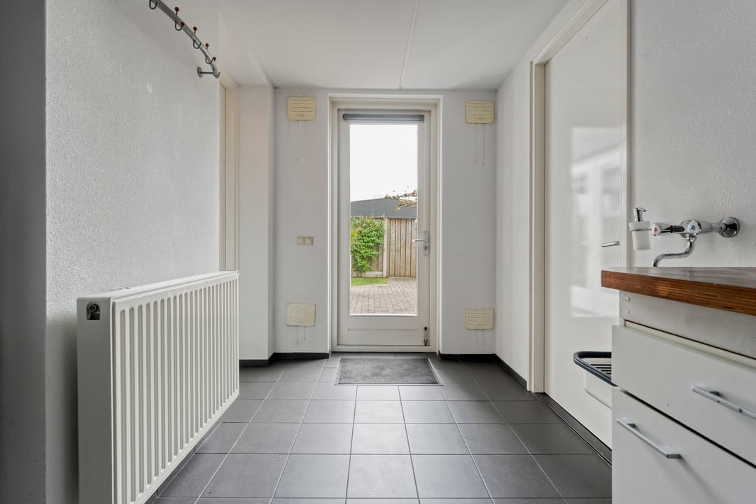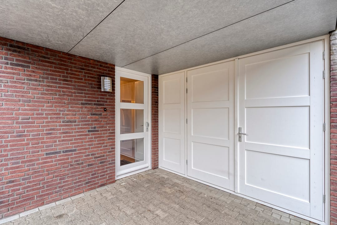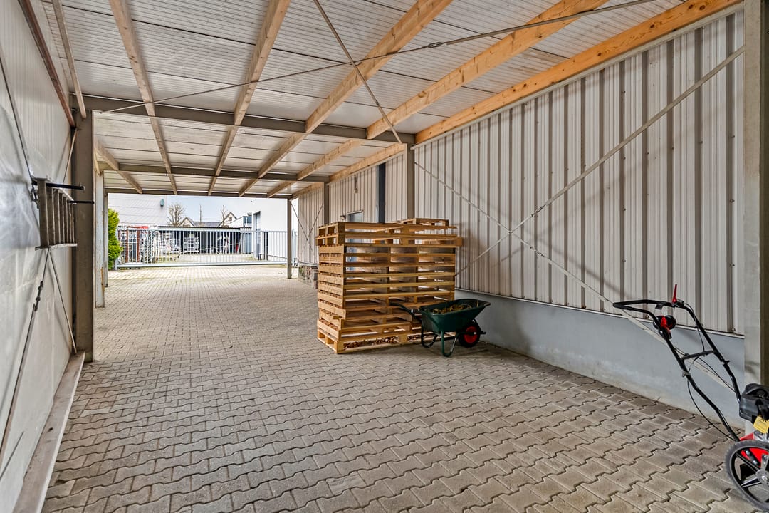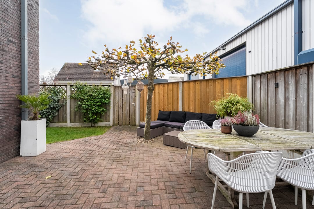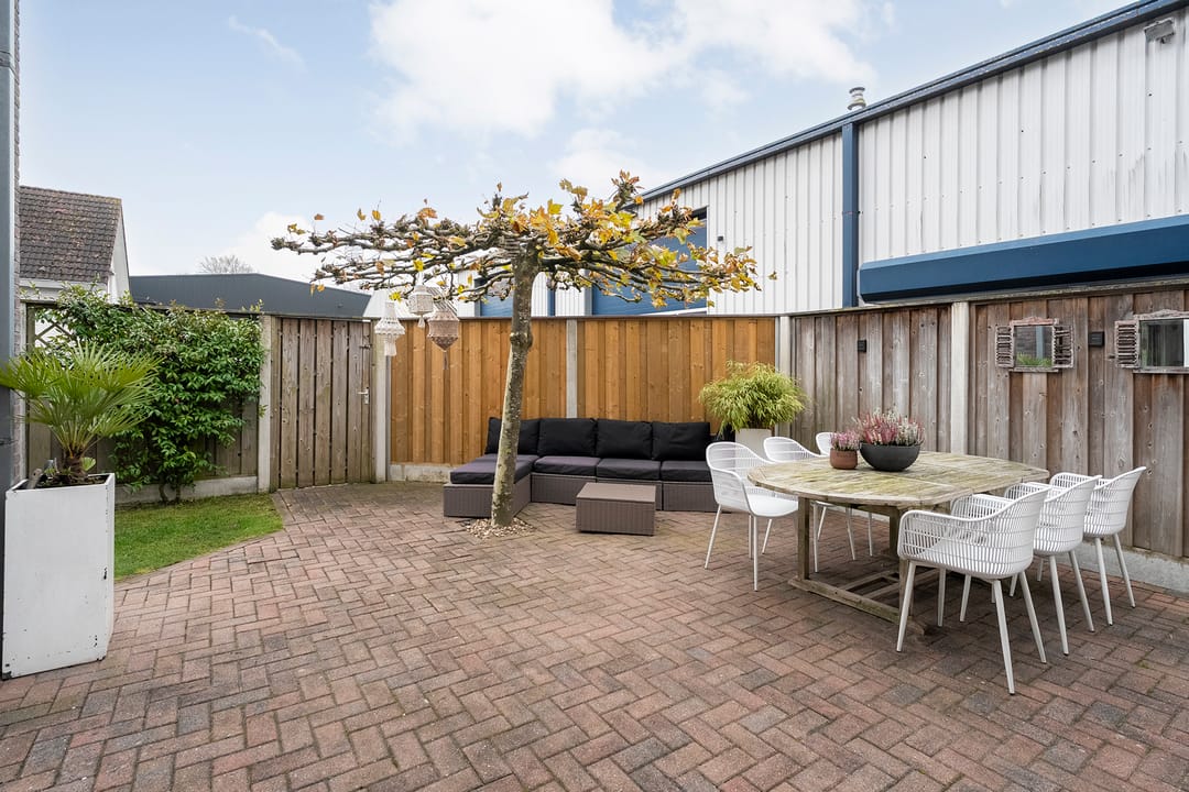 Naast de woning beschikt het object over een royaal buitenterrein en een grote geïsoleerde bedrijfsruimte. De bedrijfsruimte is voorzien van zonnepanelen en twee overheaddeuren, waardoor deze uitstekend toegankelijk is als opslaglocatie of werkplaats. Via een vaste trap is de entresol te bereiken. Onder de entresol bevinden zich een kantoorruimte, toiletruimte en stookruimte met opstelplaats voor de CV-installatie. Via de zijkant van het pand bereik je de achtergelegen overkapping met garage. De garage is tevens voorzien van een overheaddeur.