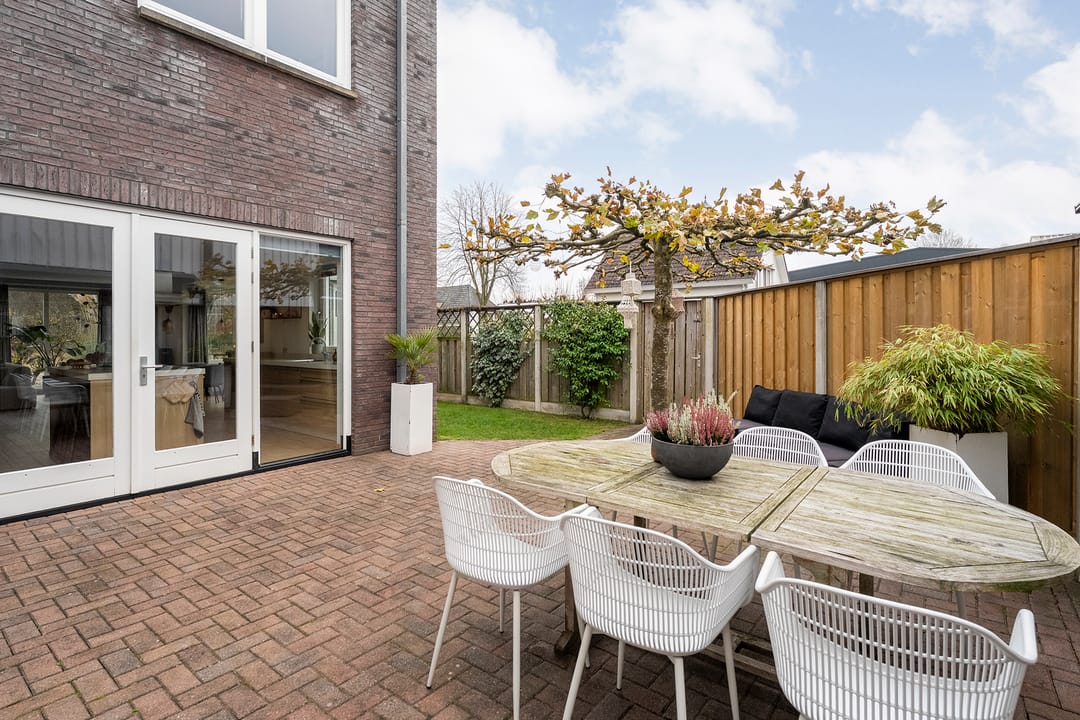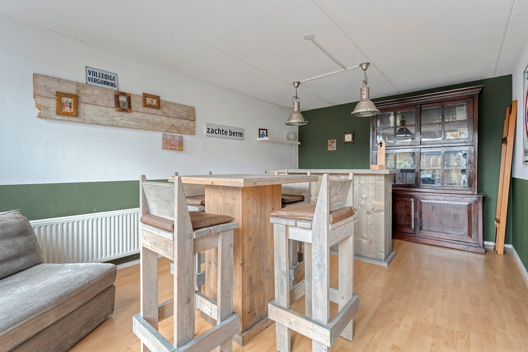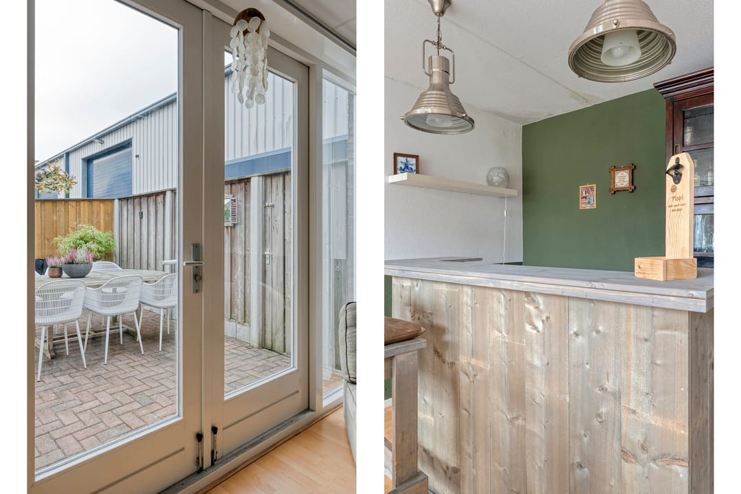 Via de voordeur kom je binnen in de royale entree met toiletruimte, garderobe en trapopgang naar de eerste verdieping. In de moderne, fraaie open keuken met kookeiland voel je je gelijk thuis. Via de openslaande deuren heb je toegang tot de achtertuin. De woonkamer met palletkachel is licht en voelt aangenaam aan dankzij de vele raampartijen en de mooie erker. Tevens vind je op de begane grond een berging met keukenblok en daarachter nog eens een gezellige ruimte die thans als bar in gebruik is en die een eigen ingang heeft via de tuin. Deze ruimte zou ook goed dienst kunnen doen als salon, kantoor, game/speelruimte of slaapkamer.