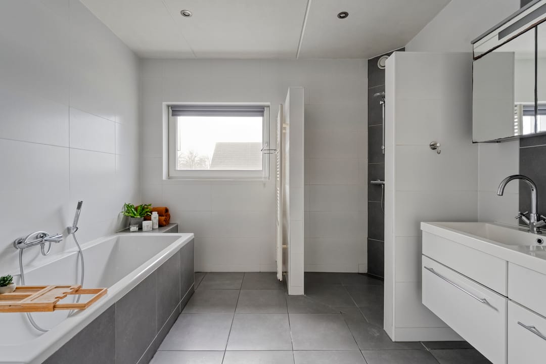 Op de eerste verdieping bevinden zich drie ruime slaapkamers, ieder met veel natuurlijk lichtinval. De master bedroom is voorzien van een inloopkast en de royale badkamer is uitgerust met een inloopdouche, ligbad en dubbele wastafel. Op de overloop tref je tevens de aparte toiletruimte en de trapopgang naar de tweede verdieping.