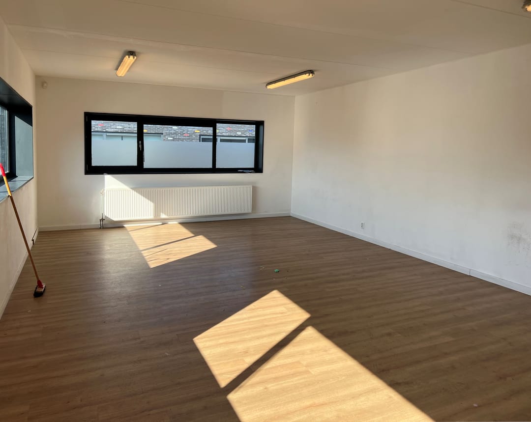 De bedrijfs-/kantoorunit is toegankelijk via een entree/hal aan de achterzijde van het complex met houten trapopgang naar de kantoorverdieping en via de elektrisch bedienbare overheaddeur met loopdeur in de voorgevel. De bedrijfsruimte op de begane grond is o.a. voorzien van een betonvloer met coating, elektrische overheaddeur, verlichtingsarmaturen, pantry en toiletruimte. De kantoorverdieping is o.a. voorzien van afgewerkte wanden en plafonds, verlichtingsarmaturen, ruime daglichttoetreding door raampartijen in zowel de voor- als zijgevel, pantry en een betegelde toiletruimte.
