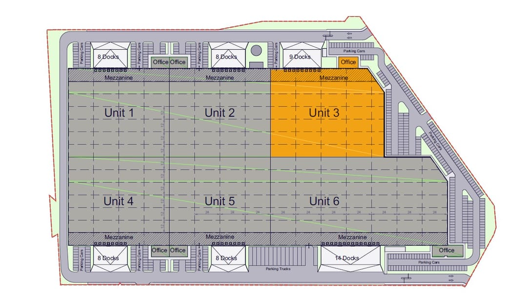 - Loading docks, overheaddeuren, krachtstroom, betonvloer, sprinkler, heater, toilet en pantry