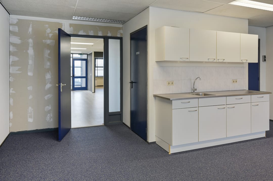 entree-hal, royale kantoor-/werkruimte met kitchenette voorzien van een airco-unit.