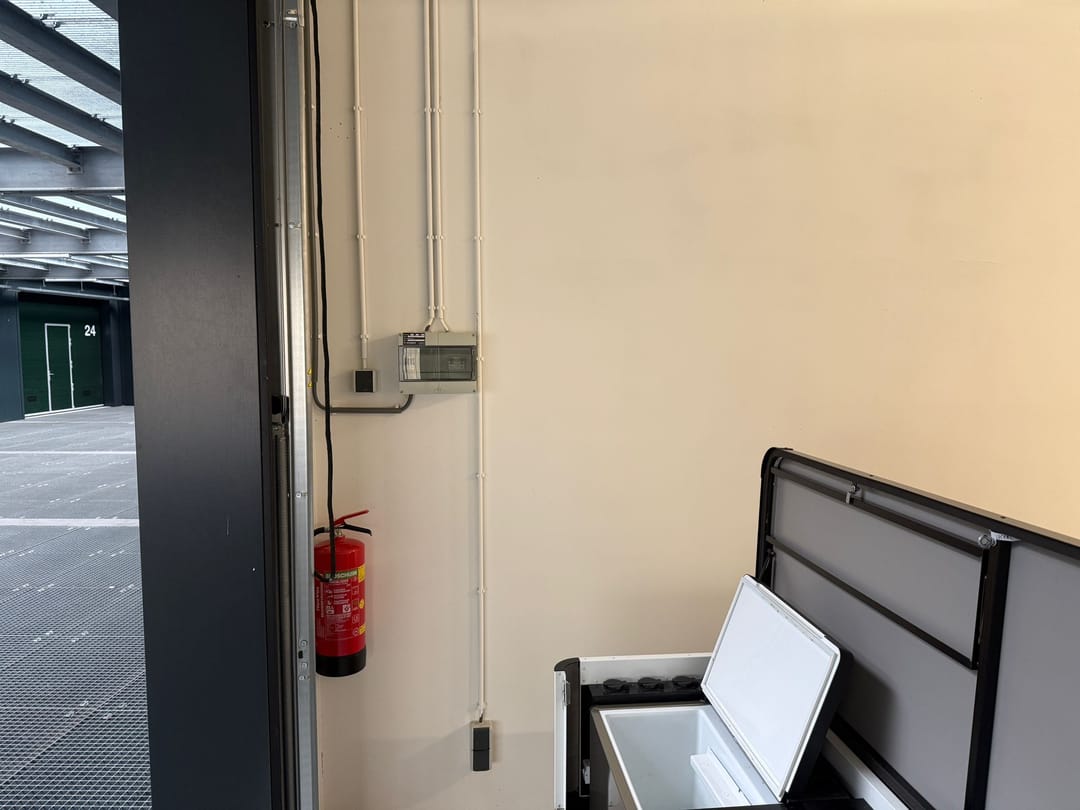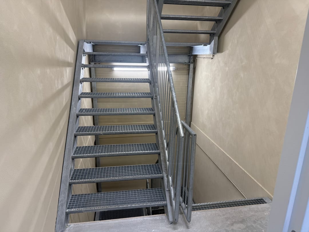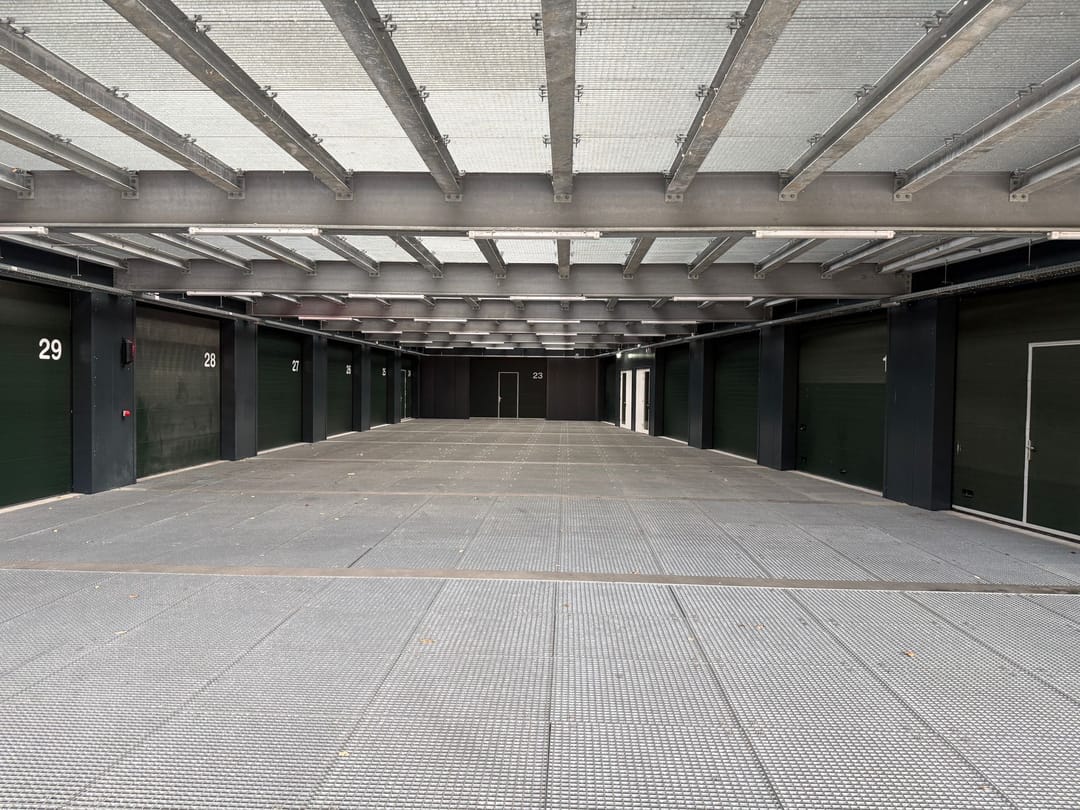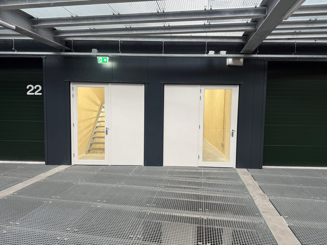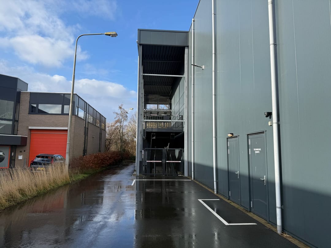 De entree bevindt zich aan de voorzijde van het gebouw. Via een autolift of trap bereikt u de eerste verdieping, waar de opslagunit is gelegen.