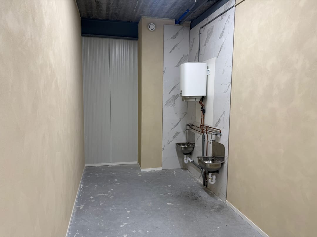 - Gemeenschappelijke sanitaire ruimte met een toilet, wasbak en uitstortgootsteen.
