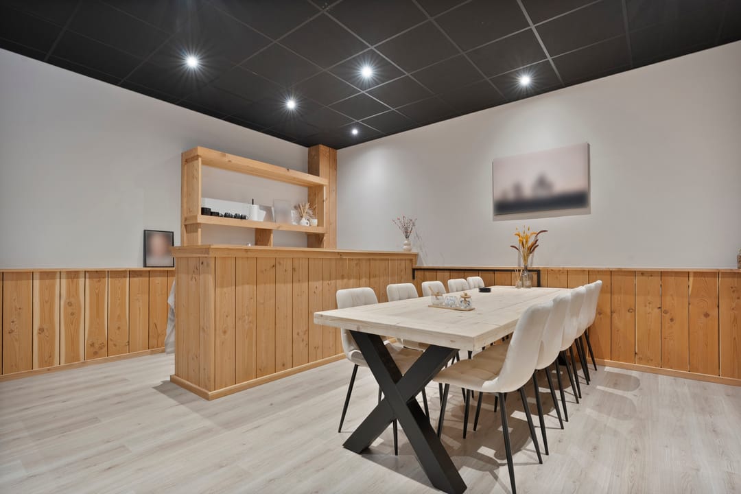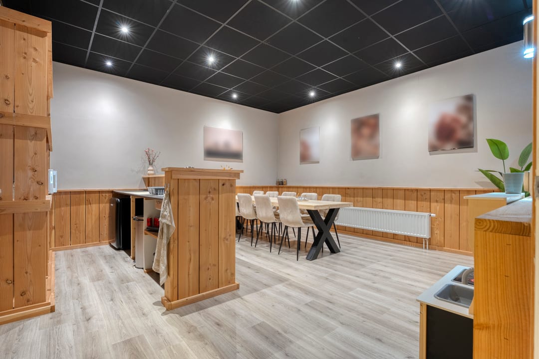 - Begane grond (ca. 77 m²): bedrijfsruimte v.v. keukenblok, werkplaats, vaste trap naar de tussenverdieping en eerste verdieping.