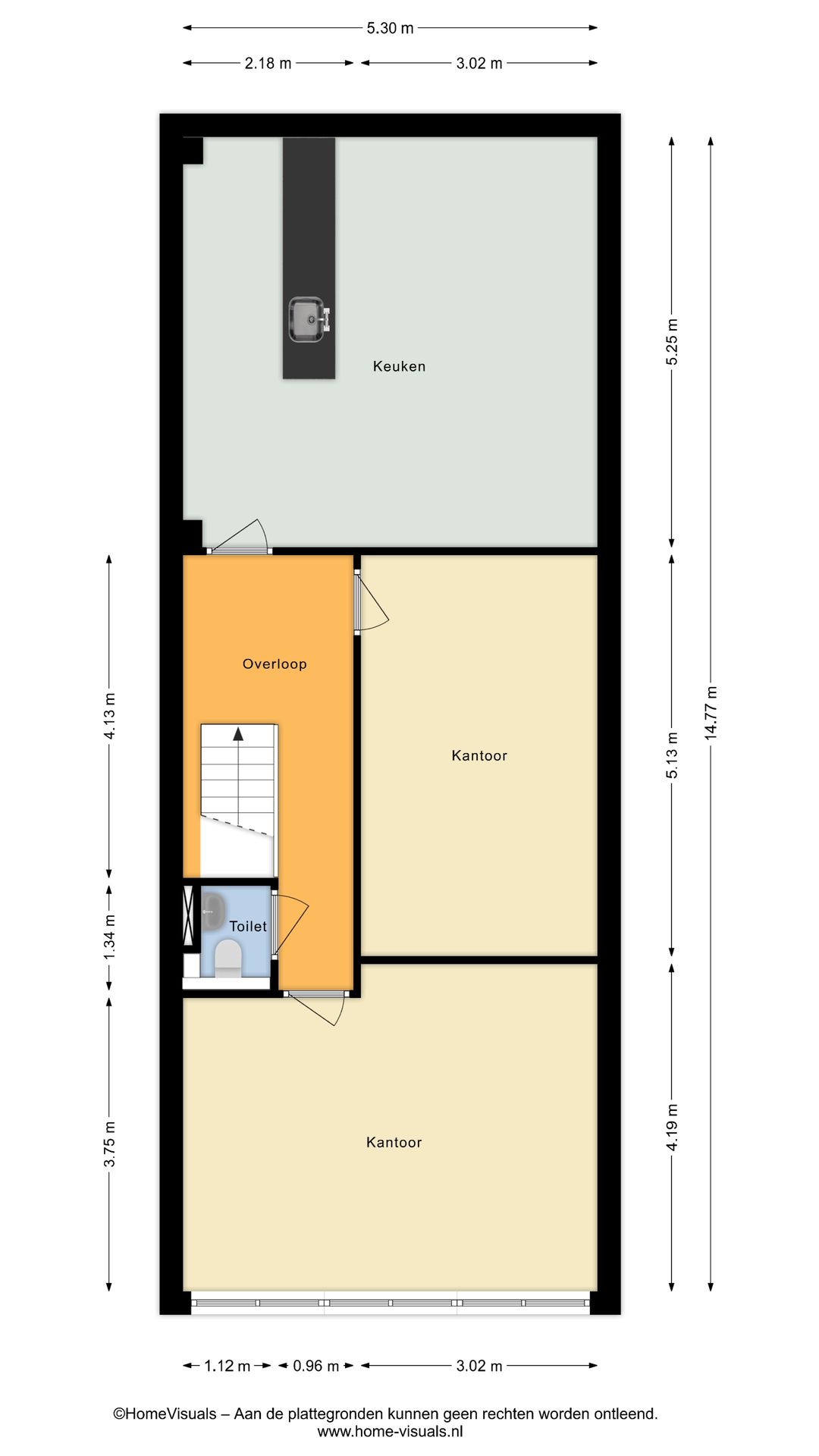 - Eerste verdieping (ca. 74 m²): overloop, keuken/kantine v.v. keukenblok, kantoorruimte I, kantoorruimte II.