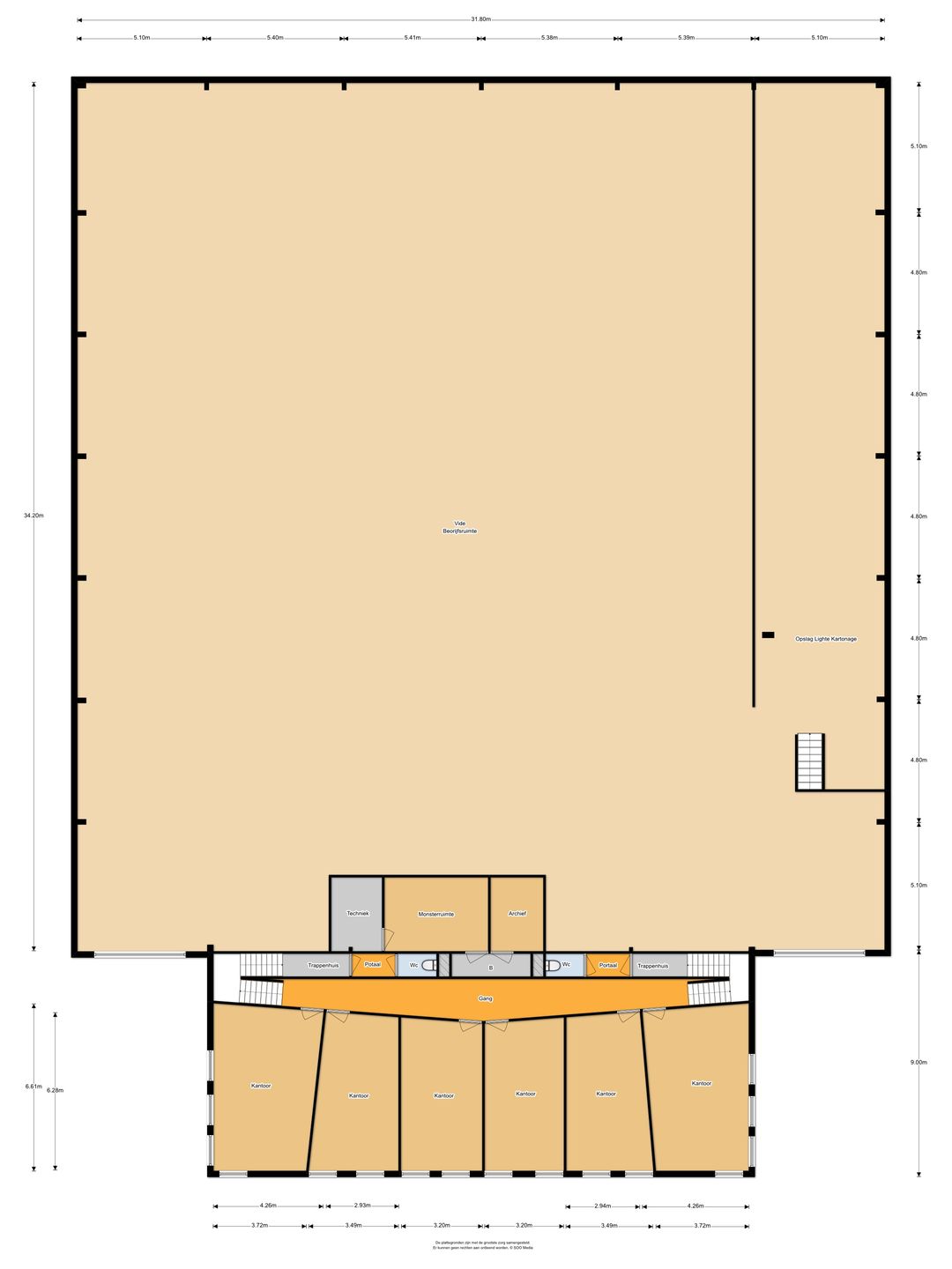- Verdieping: circa 450 m² b.v.o. kantoorruimte.