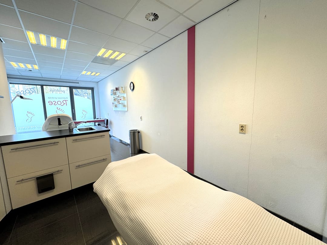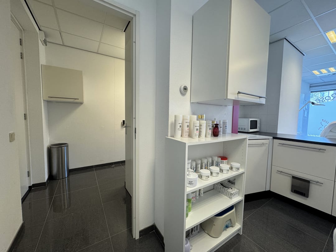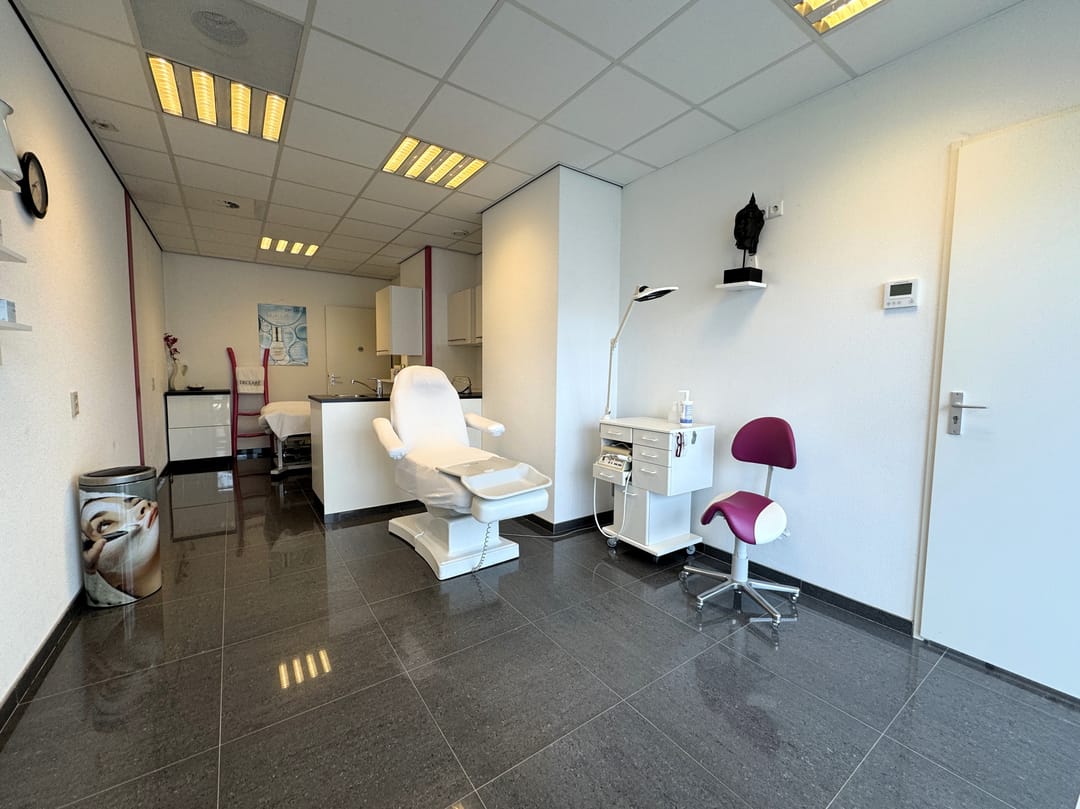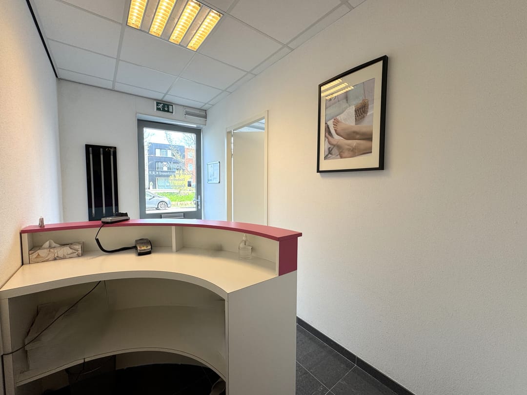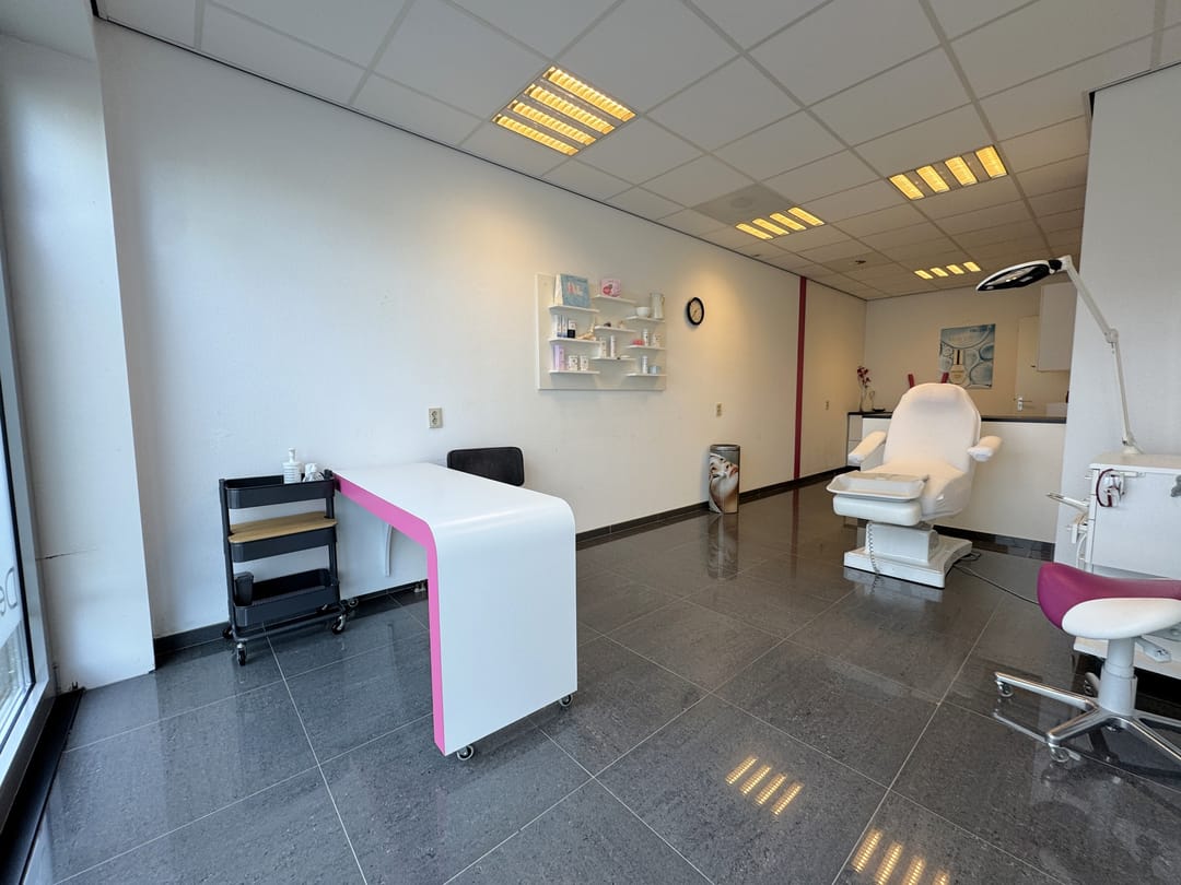 Momenteel is de ruimte ingericht voor de beauty branche met een aparte ingang die te bereiken is via de voordeur waar de balie staat om mensen te ontvangen. Via de tussendeur kom je binnen in de praktijkruimte.