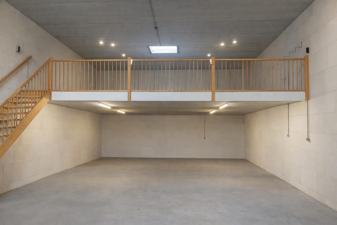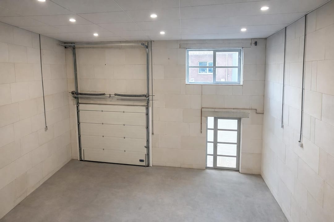 - Overheaddeuren, krachtstroom, betonvloer, toilet, pantry, inbouwarmaturen en te openen ramen