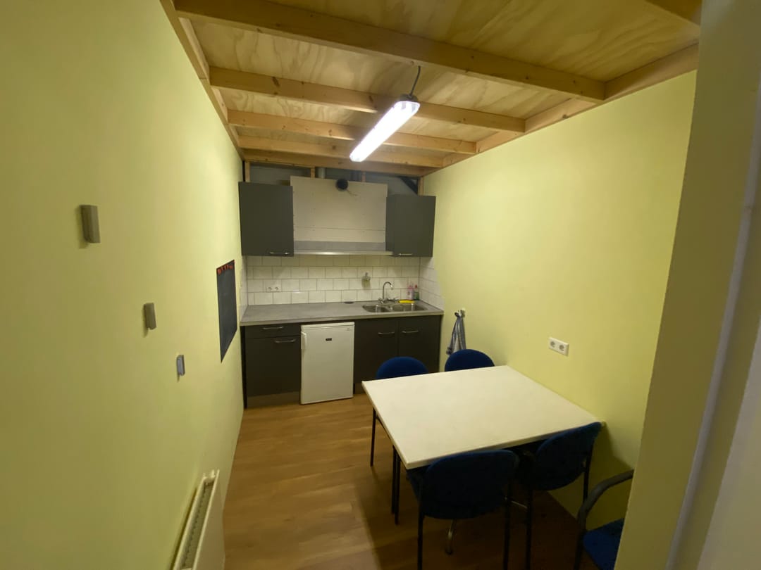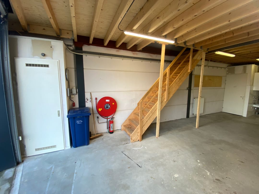 Verdieping: werk-/kantoorruimte van ca. 49 m², uitgerust met een separate keuken/kantine. De houten verdiepingsvloer heeft een vloerbelasting van circa 500 kg/m².