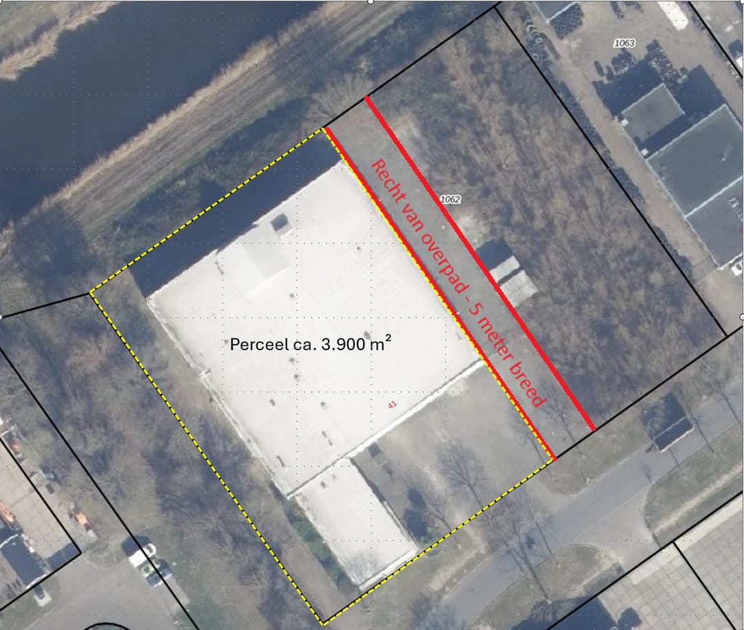 Het object zal kadastraal worden gesplitst. Het te verkopen gedeelte betreft het linkerdeel van het perceel en het daarop aanwezige bedrijfsobject, waarbij de nieuwe erfgrens zal komen te liggen ter hoogte van de rechterzijde van het gebouw (conform indicatie op de bijgevoegde situatietekening).