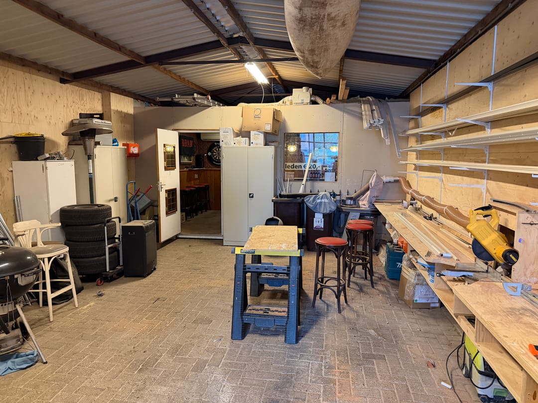 De entree leidt direct naar de grote, hoge bedrijfsruimte die ideaal geschikt is voor opslag, ambachtelijke werkzaamheden, montage of stalling. De brede toegang maakt de ruimte goed bereikbaar voor materialen, gereedschap en voertuigen. Aan weerszijden is veel wandruimte beschikbaar voor opslag, stellingen of vitrages, en de ruimte is voorzien van verlichting en een betonnen vloer.