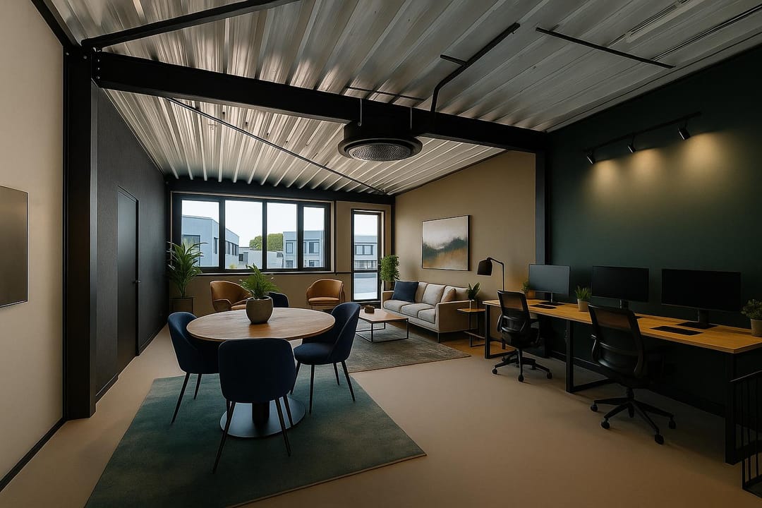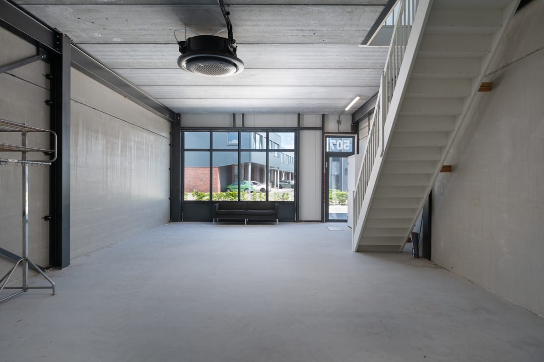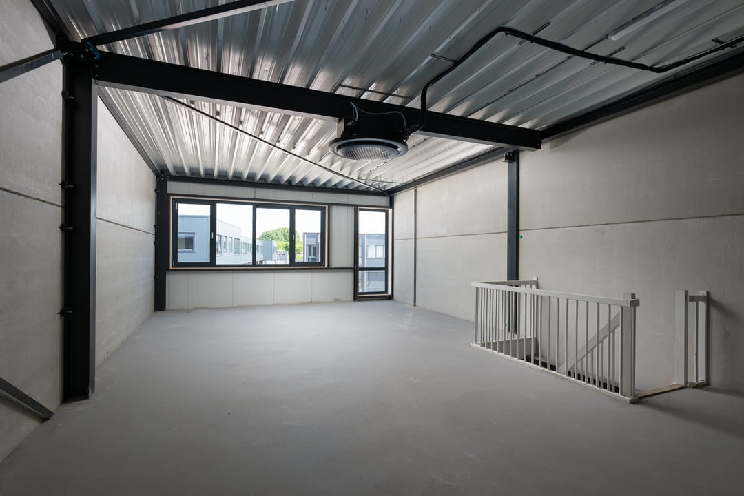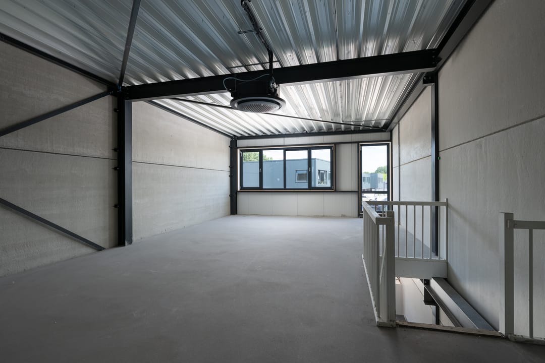 De open structuur en glazen gevel maken deze unit uitermate geschikt voor uiteenlopende bedrijfsdoeleinden, zoals kantoor, showroom, winkel of lichte werkruimte. De koper heeft alle vrijheid om de afbouw af te stemmen op zijn eigen stijl, merk en gebruiksbehoeften.