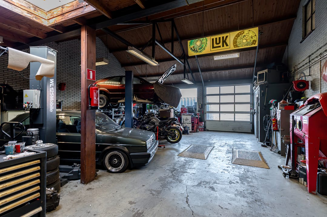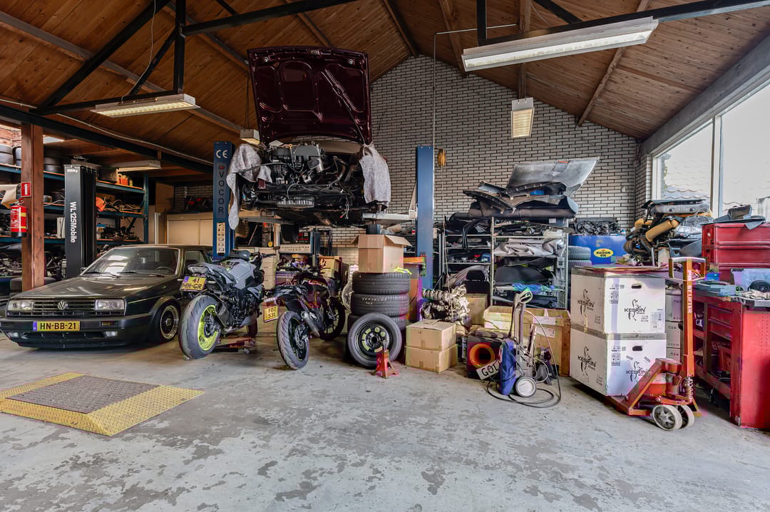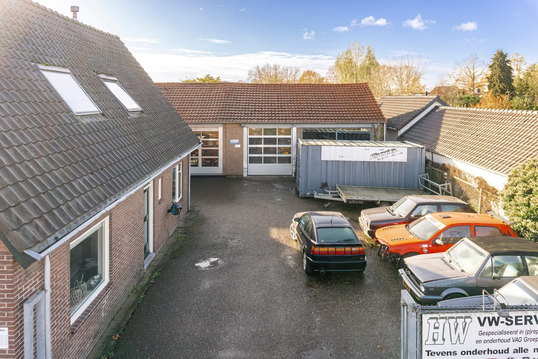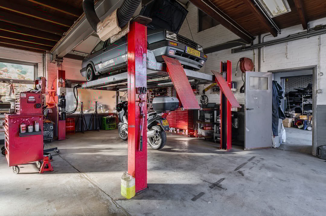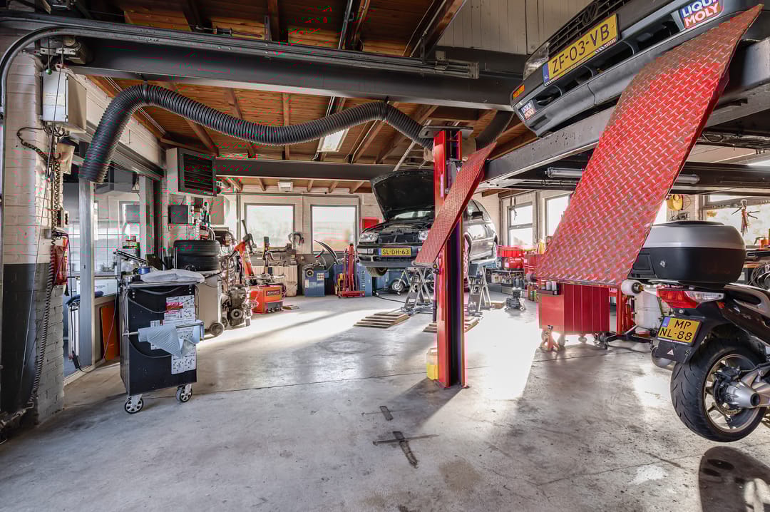 GROTE HAL: Bereikbaar via een interne doorgang. Deze hal beschikt over overheaddeuren aan zowel de voor- als achterzijde, wat een praktische doorrijmogelijkheid creëert met een vrije hoogte van 3 meter. In deze hal bevinden zich een vaste 2-koloms hefbrug, een vaste 4-koloms hefbrug en een losse 1-koloms hefbrug. De overheaddeur aan de achterzijde geeft direct toegang tot het achtergelegen buitenterrein, dat extra ruimte biedt voor opslag of stalling. Binnen deze hal zijn twee werkruimtes gecreëerd op de begane grond, met daarboven een verdieping die uitermate geschikt is als extra opslagetage. De opslagetage is bereikbaar via een trap in de grote hal.