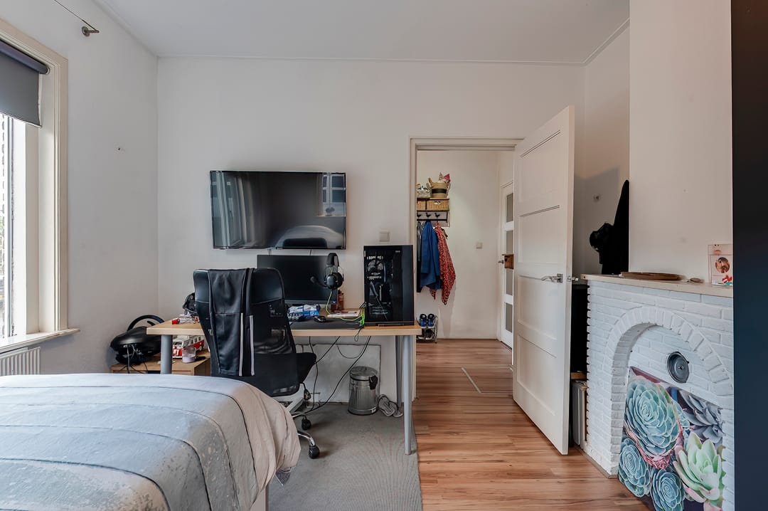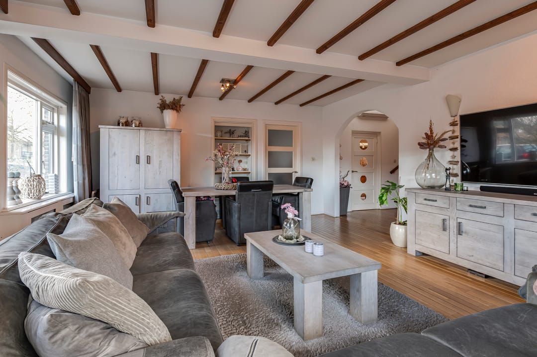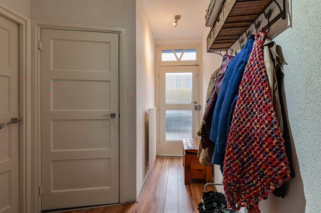 De woning heeft een karakteristiek aanzicht door het hoge zadeldak, dat aan de linkerzijde is afgewerkt met een fraai wolfseind. De woning is verrassend ruim opgezet. Bij binnenkomst via de hal heeft u direct toegang tot de eerste slaapkamer, toiletruimte en de woonkamer. De woonkamer staat in directe verbinding met zowel de keuken als de tweede slaapkamer op de begane grond. Ook vindt u in de woonkamer de trap naar de eerste etage.