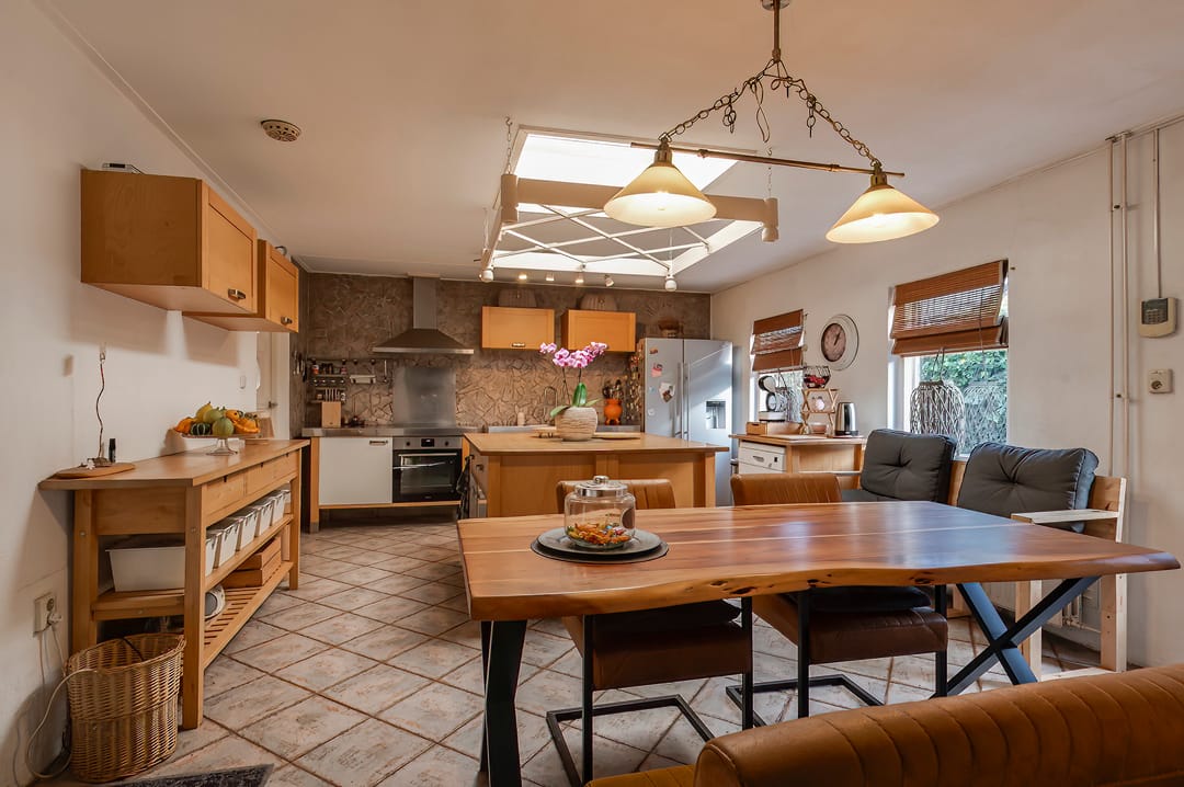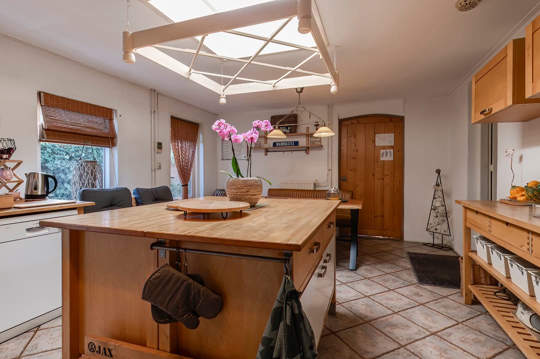 Vanuit de woonkamer loopt u zo de keuken in. Deze keuken is ruim opgezet, beschikt over een keukeneiland en biedt genoeg plaats voor een gezellige eethoek. Daarnaast heeft de keuken een eigen buitendeur naar de zijtuin. Het is een praktisch knooppunt in het huis met directe verbindingen naar de woonkamer, pantry, tuin en het kantoor.