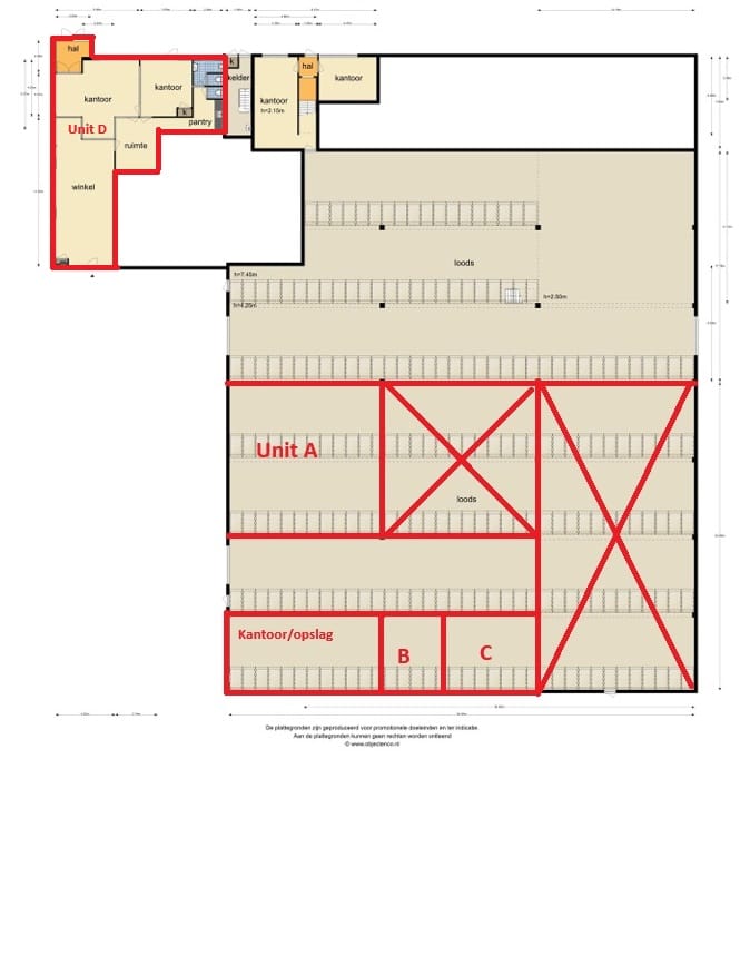 Het aanbod omvat verschillende typen ruimten, variërend van kantoor- en winkelruimte met kelder tot praktische bedrijfsunits en een royaal buitenterrein. De kantoorruimten zijn licht, goed indeelbaar en geschikt voor uiteenlopende bedrijfsactiviteiten. De hallen bieden uitstekende mogelijkheden voor opslag, werkplaats of lichte productie. Bovengelegen kantoorruimtes zijn eveneens beschikbaar en bieden een lichte en representatieve werkomgeving. Het achtergelegen terrein biedt ruimte voor laden, lossen of parkeren en kan separaat worden gehuurd.