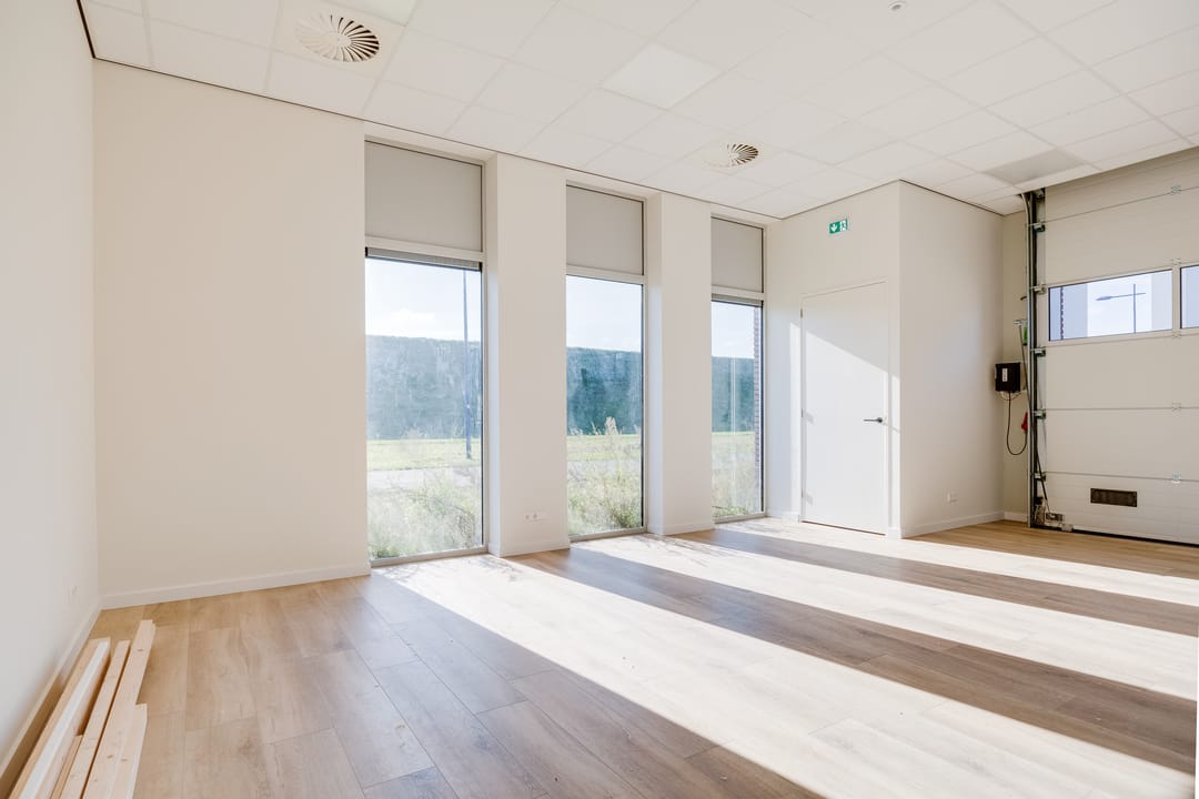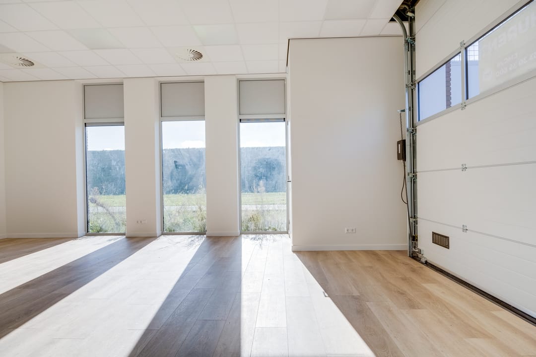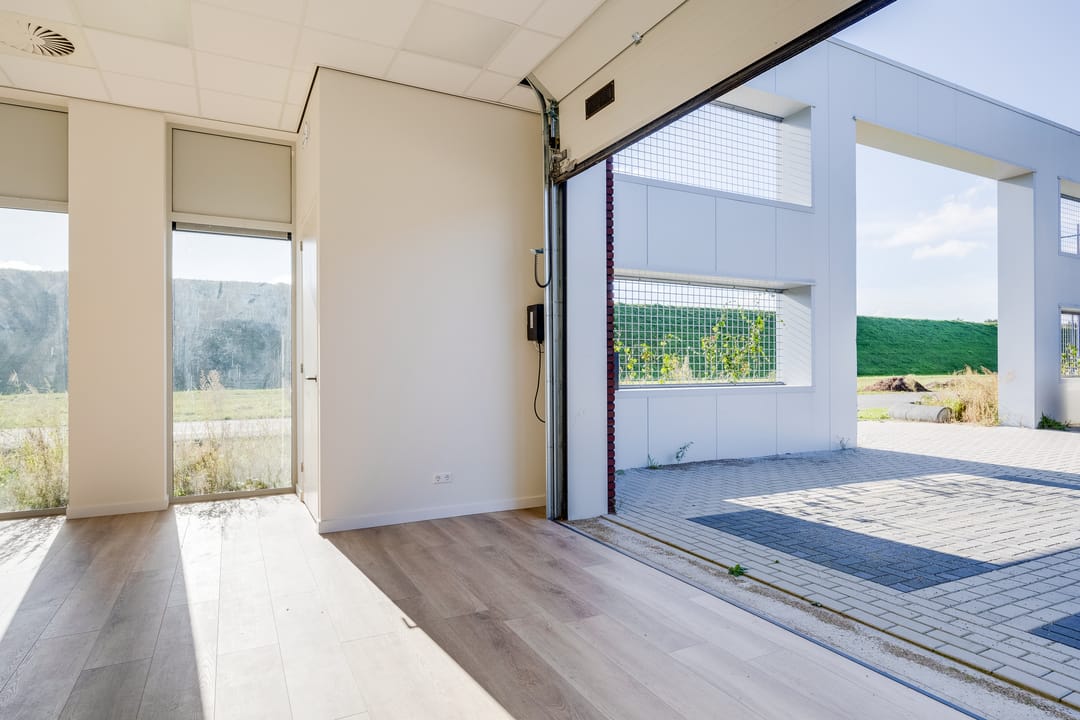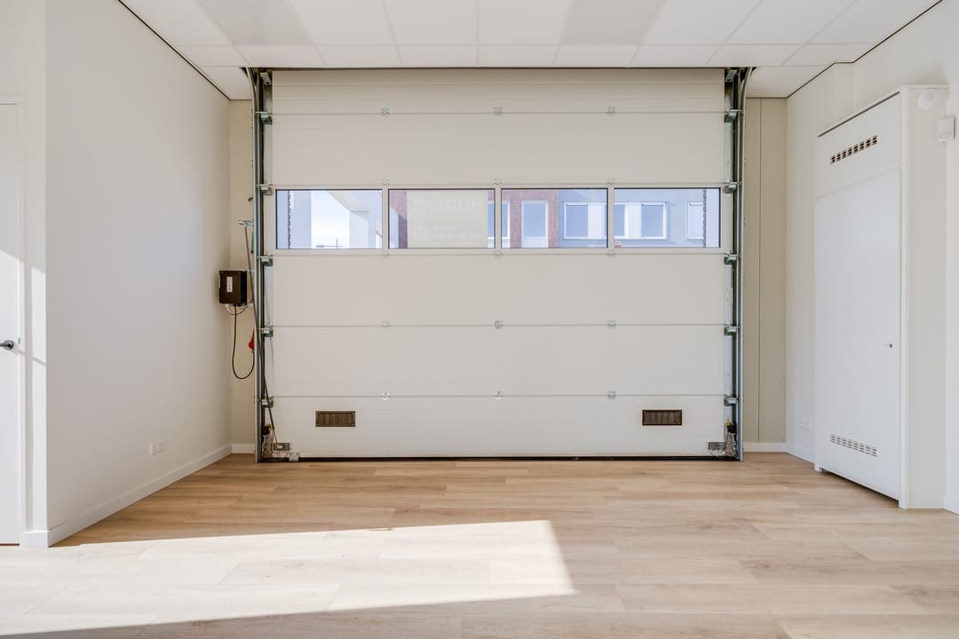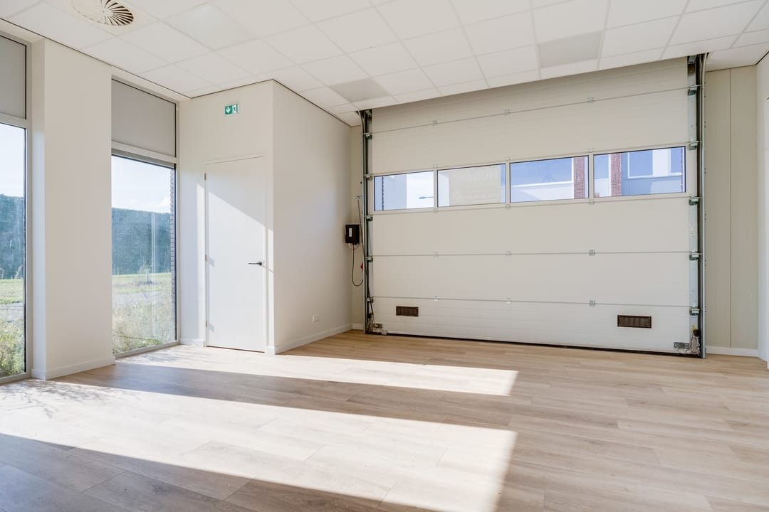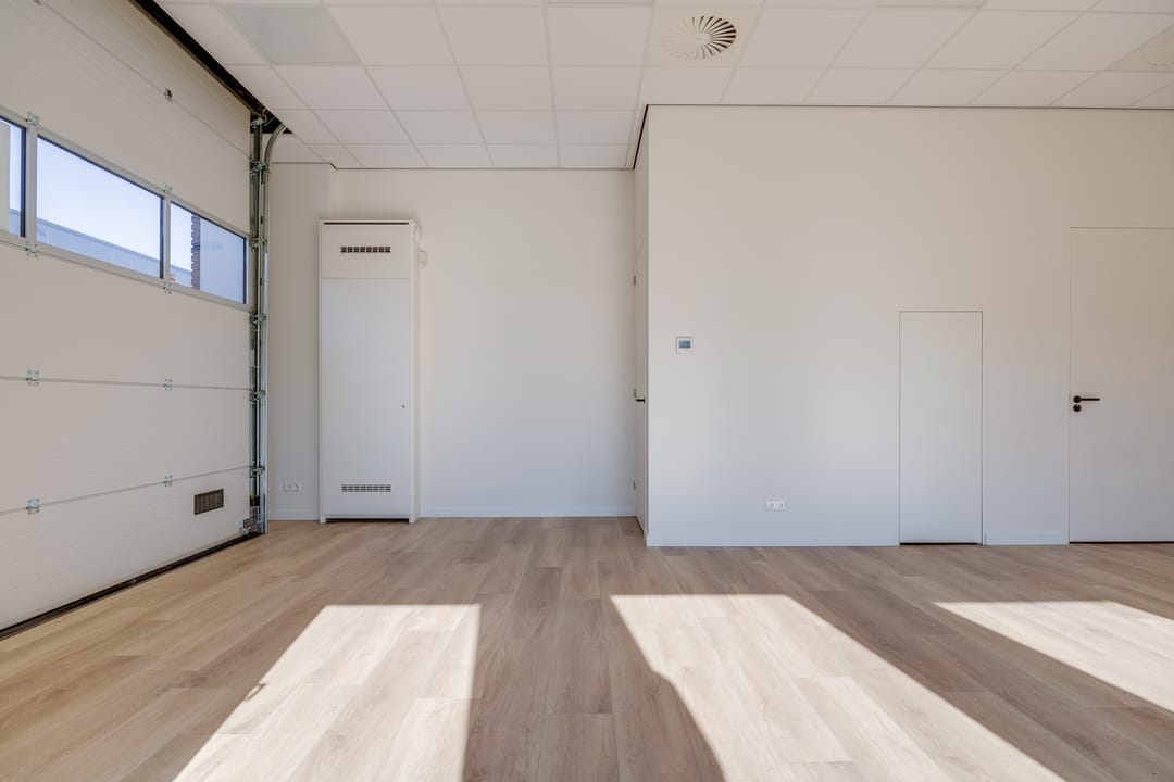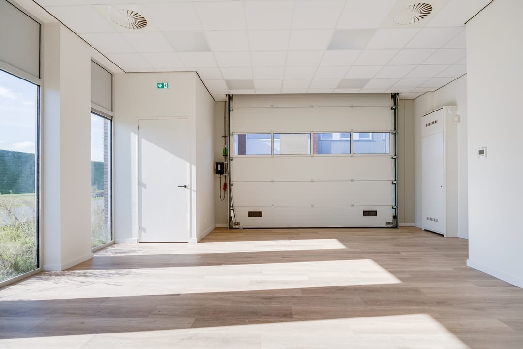 De begane grond is toegankelijk via een separate loopdeur met voorportaal én een elektrisch bedienbare overheaddeur, wat de ruimte zowel praktisch als multifunctioneel maakt. De combinatie van kamerhoge raampartijen, een nette houtlook pvc-vloer en een strak systeemplafond met verlichtingsarmaturen zorgt voor een prettige, lichte en professionele werkomgeving.
