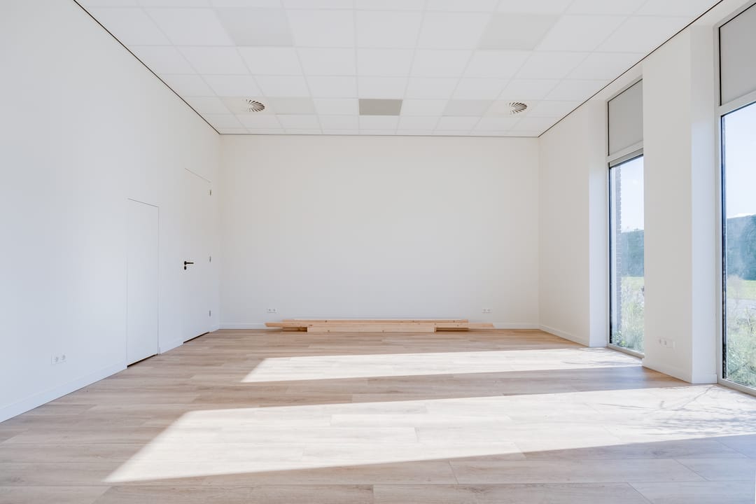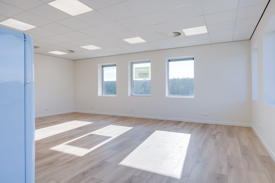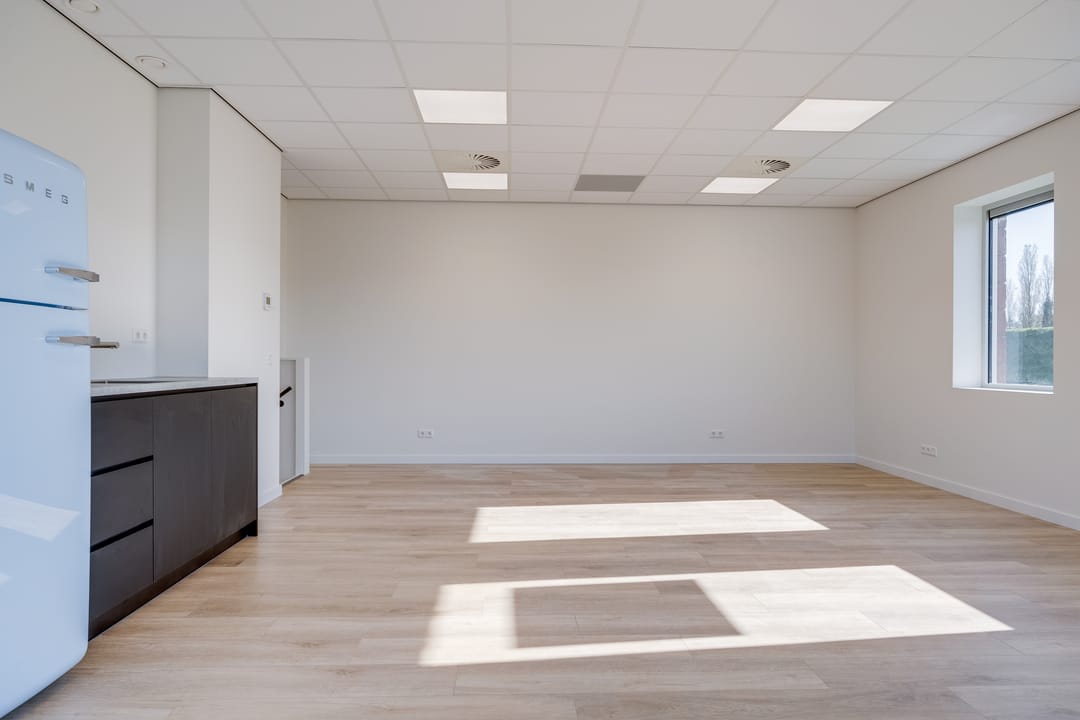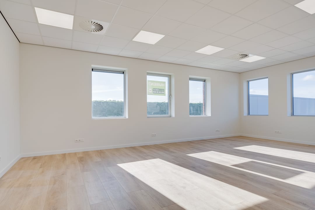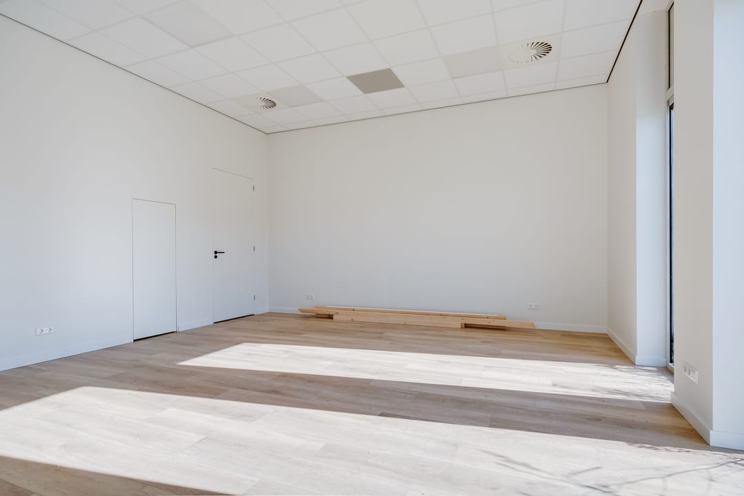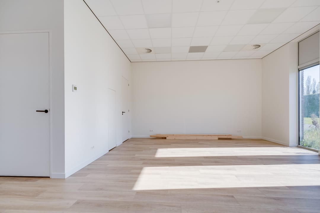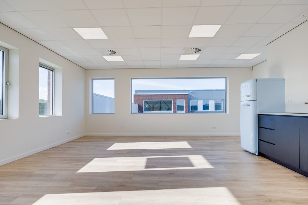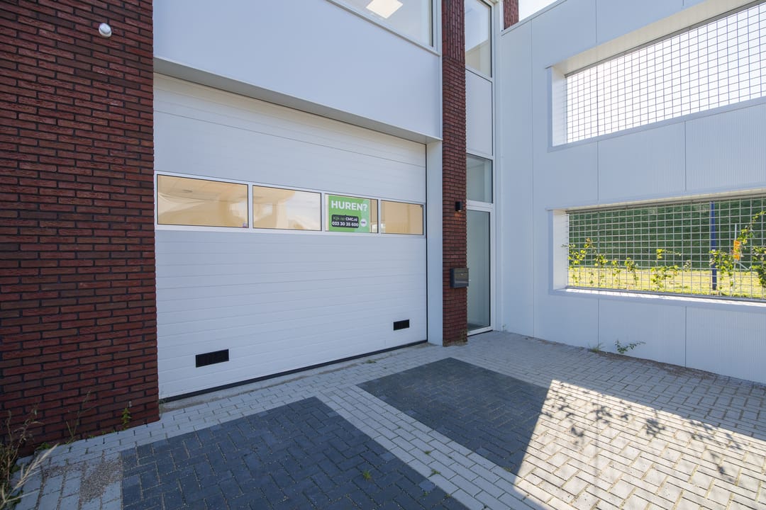 De begane grond is toegankelijk via een separate loopdeur met voorportaal én een elektrisch bedienbare overheaddeur, wat de ruimte zowel praktisch als multifunctioneel maakt. De combinatie van kamerhoge raampartijen, een nette houtlook pvc-vloer en een strak systeemplafond met verlichtingsarmaturen zorgt voor een prettige, lichte en professionele werkomgeving.