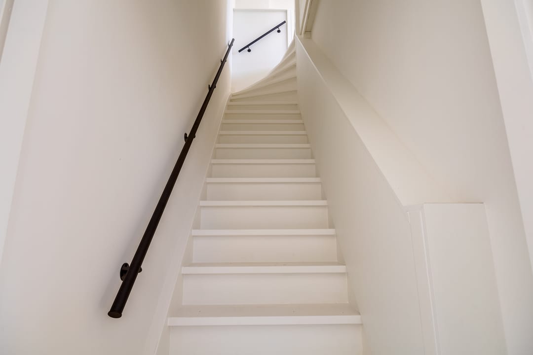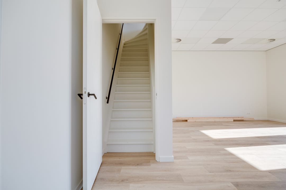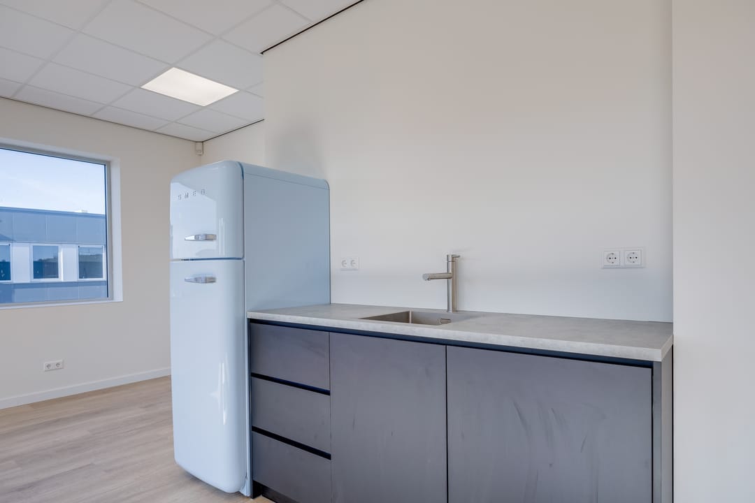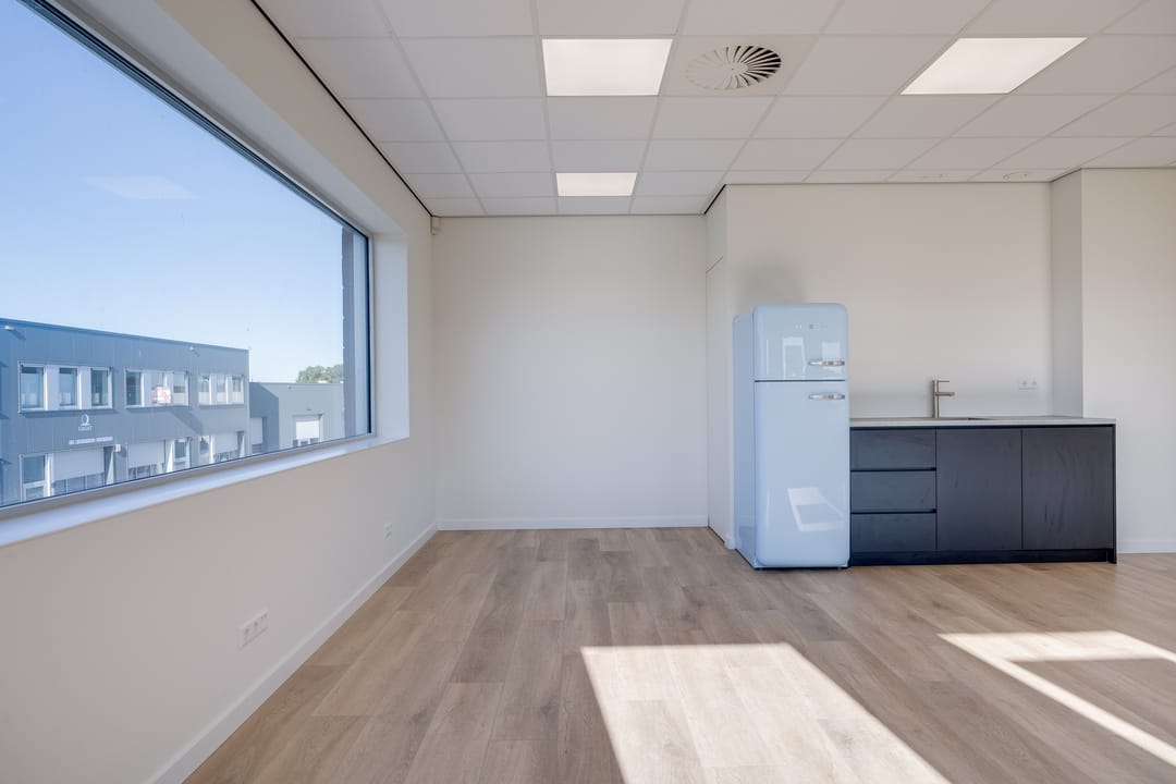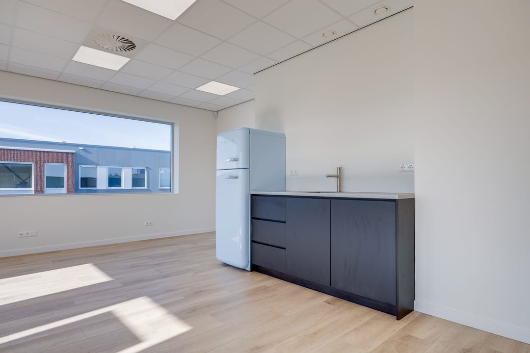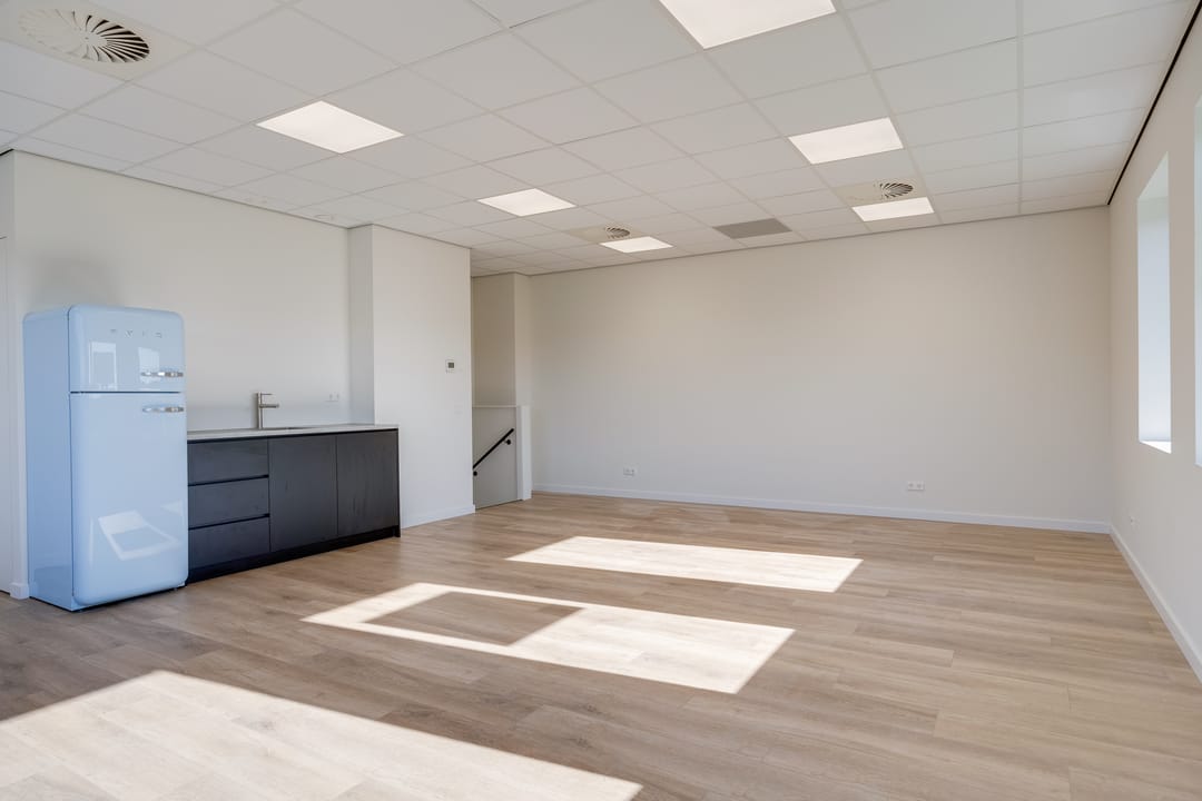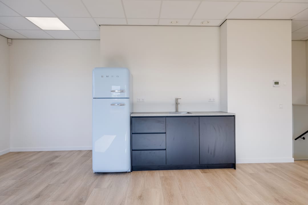 Via de houten trap bereikt u de verdieping, die zich uitstekend leent als kantoorruimte, showroom of kantine. Ook hier zorgen grote raampartijen aan de voor- en zijkant voor veel daglicht. De verdieping is bovendien voorzien van een nette pantry met een SMEG koelkast, waardoor comfort en functionaliteit hand in hand gaan.