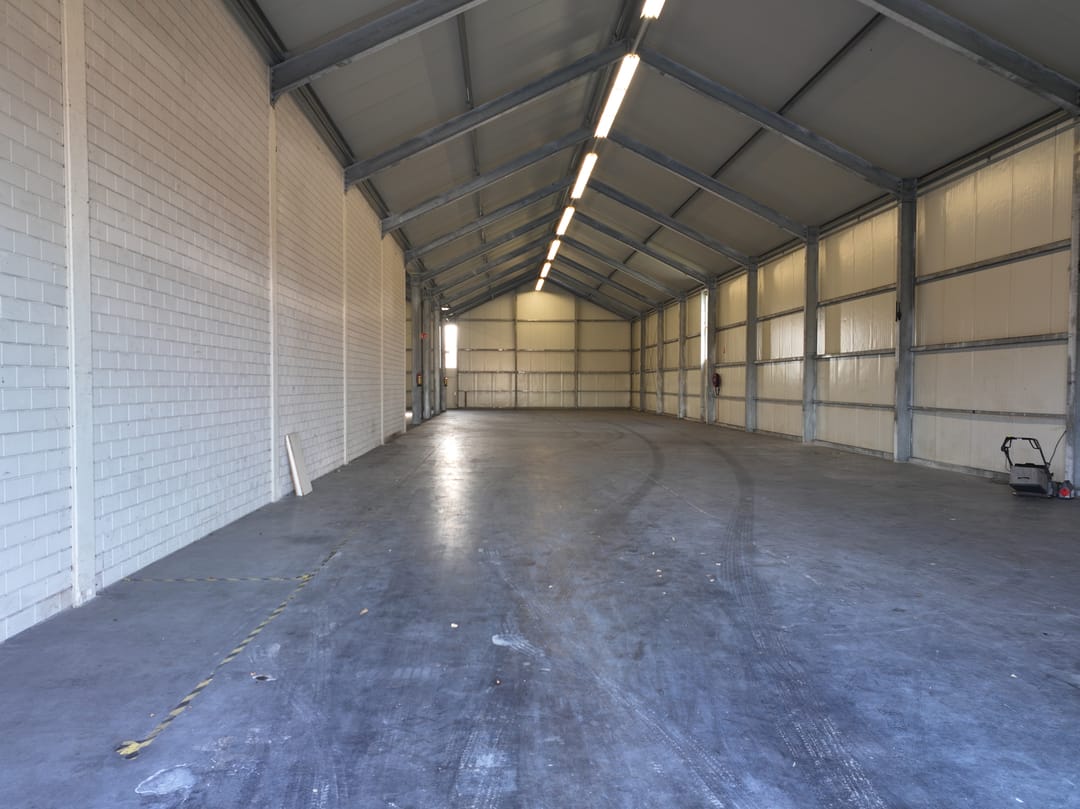- Lichtstraten, overheaddeuren, krachtstroom, betonvloer, toilet en pantry