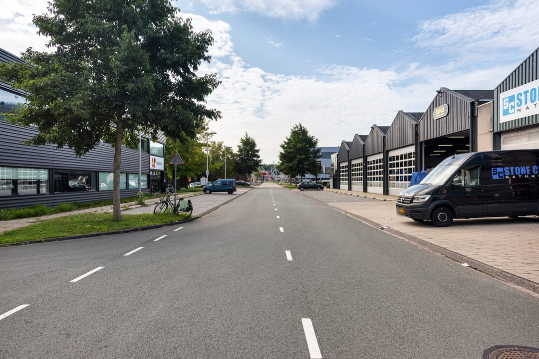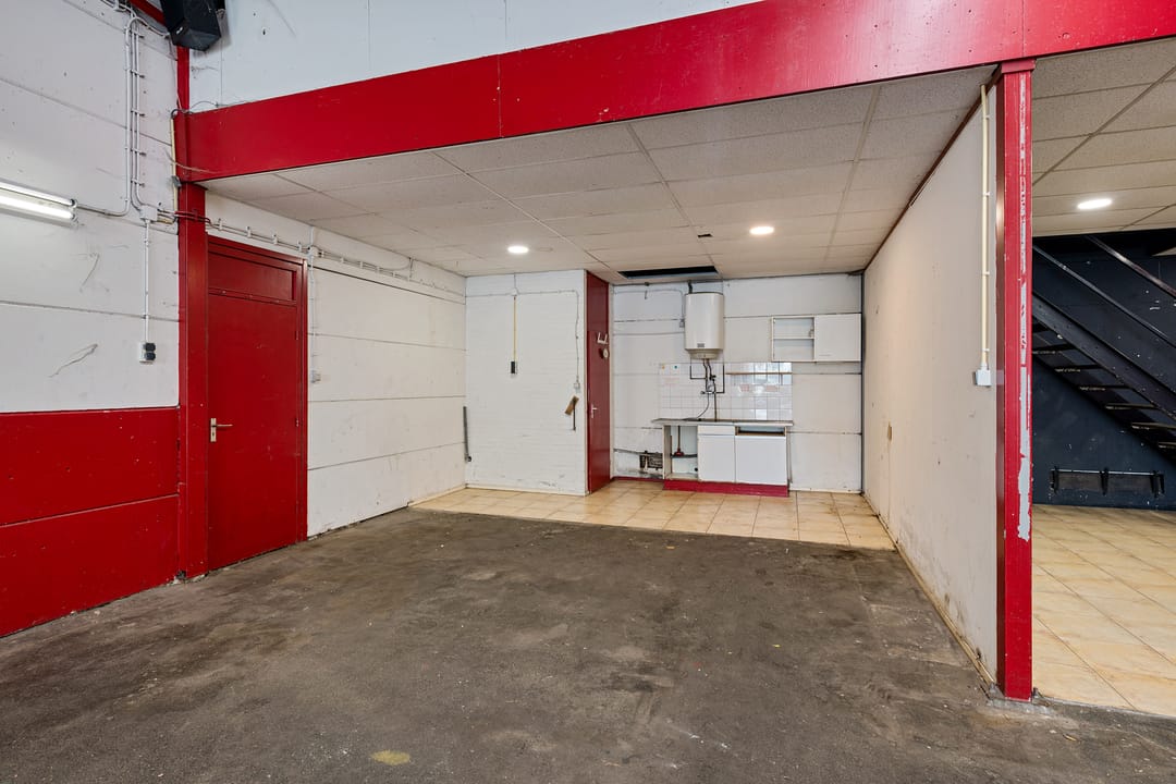 De ruimte is op dit moment ingedeeld met een grote werkplaats op de begane grond welke direct vanaf de straatzijde te bereiken is middels de twee elektrische overheaddeuren alsmede twee separate loopdeuren. Deze ruimte is voorzien van een betonvloer, nokhoogte van ca. 590 cm en een vrije hoogte van ca. 450 cm. De aanwezige voorzieningen in deze ruimte bestaan uit LED-verlichting, afzuiging en een heater, waarbij zich aan de achterzijde een pantry en toiletvoorziening bevinden. Middels een vaste trap zijn de twee kantoorruimten op de verdiepingsvloer te bereiken.