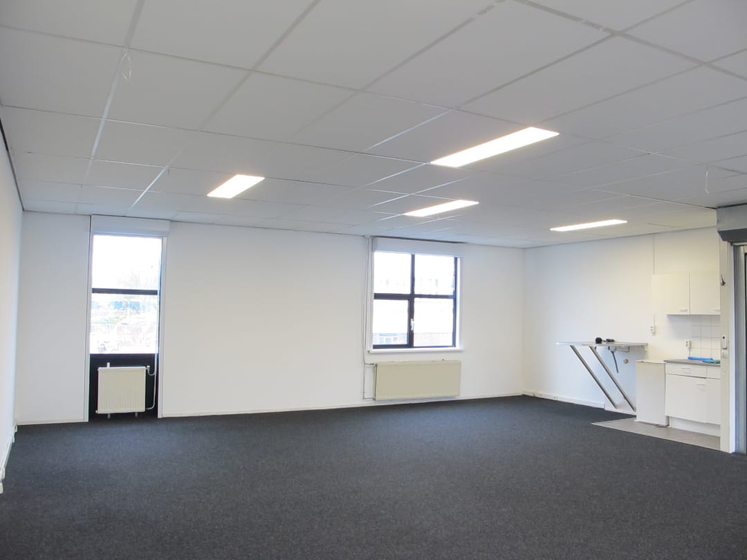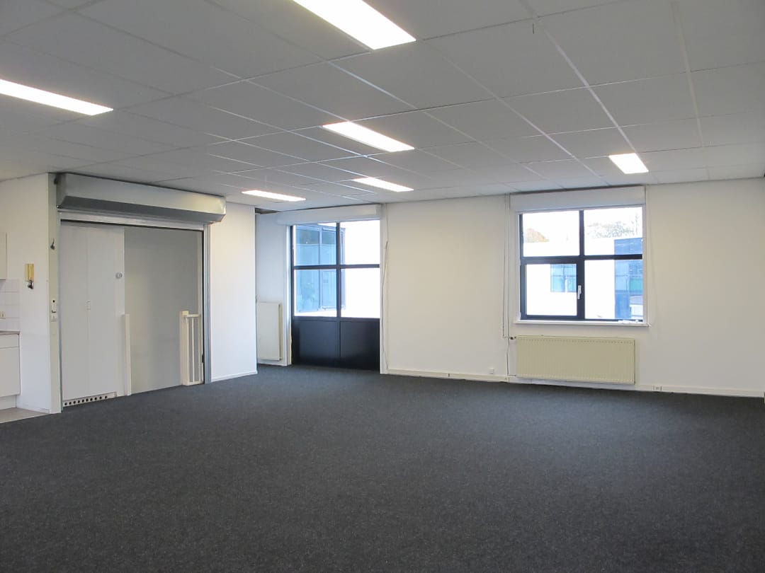 • Kantoorruimte voorzien van vloerbedekking en systeemplafond voorzien van verlichtingsarmaturen.