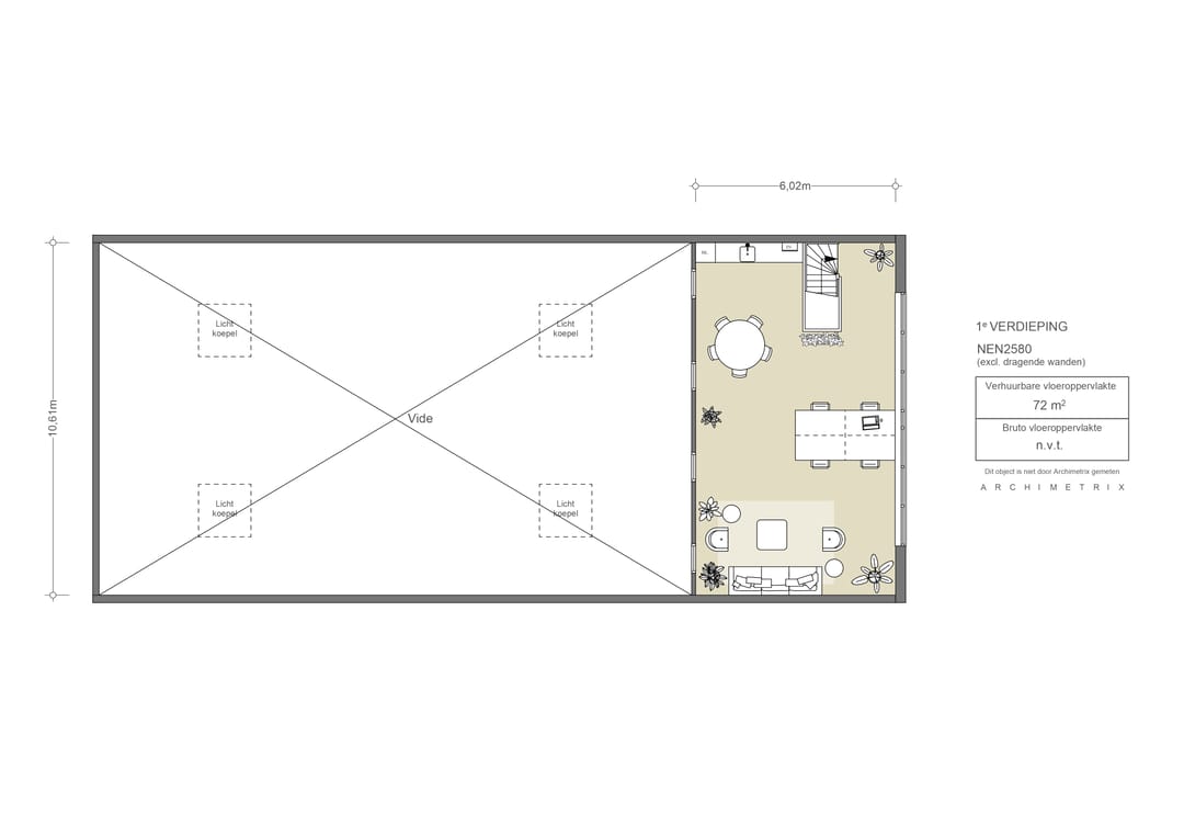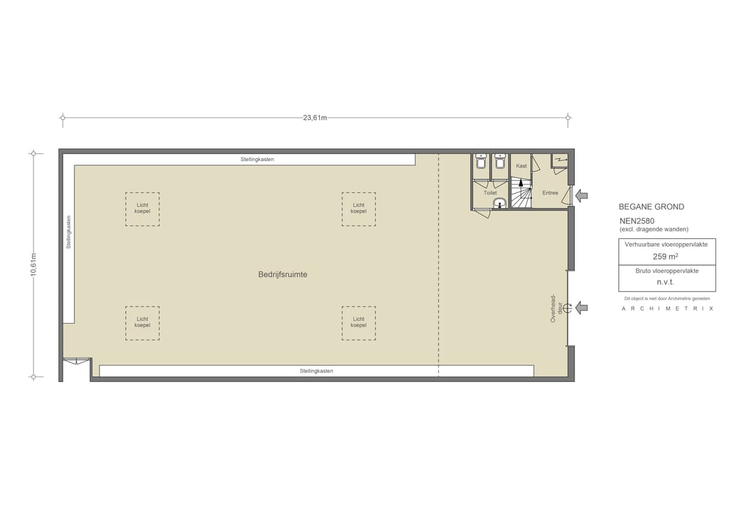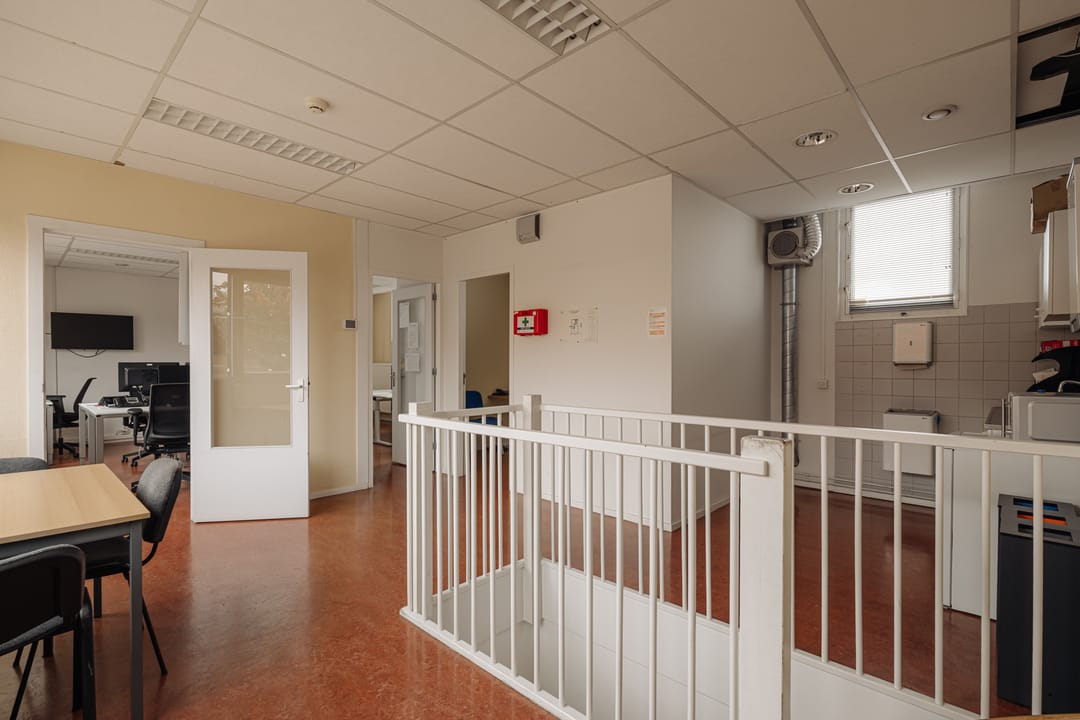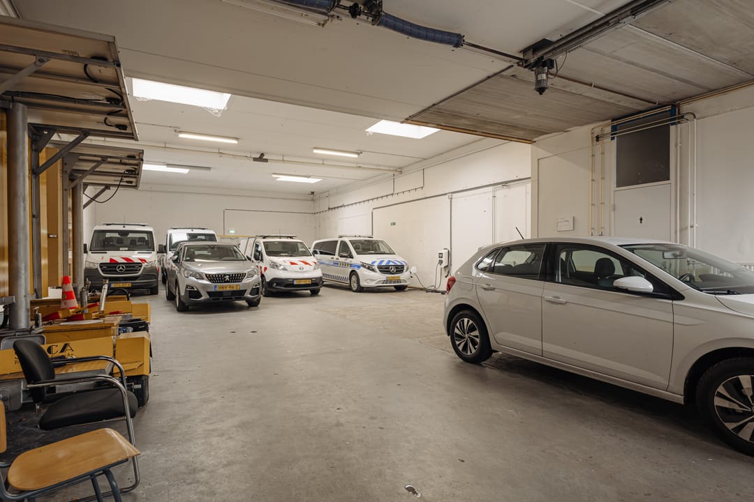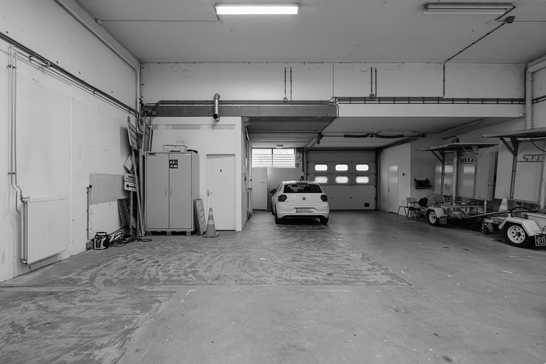 - Overheaddeuren, betonvloer, toilet, pantry, inbouwarmaturen en te openen ramen