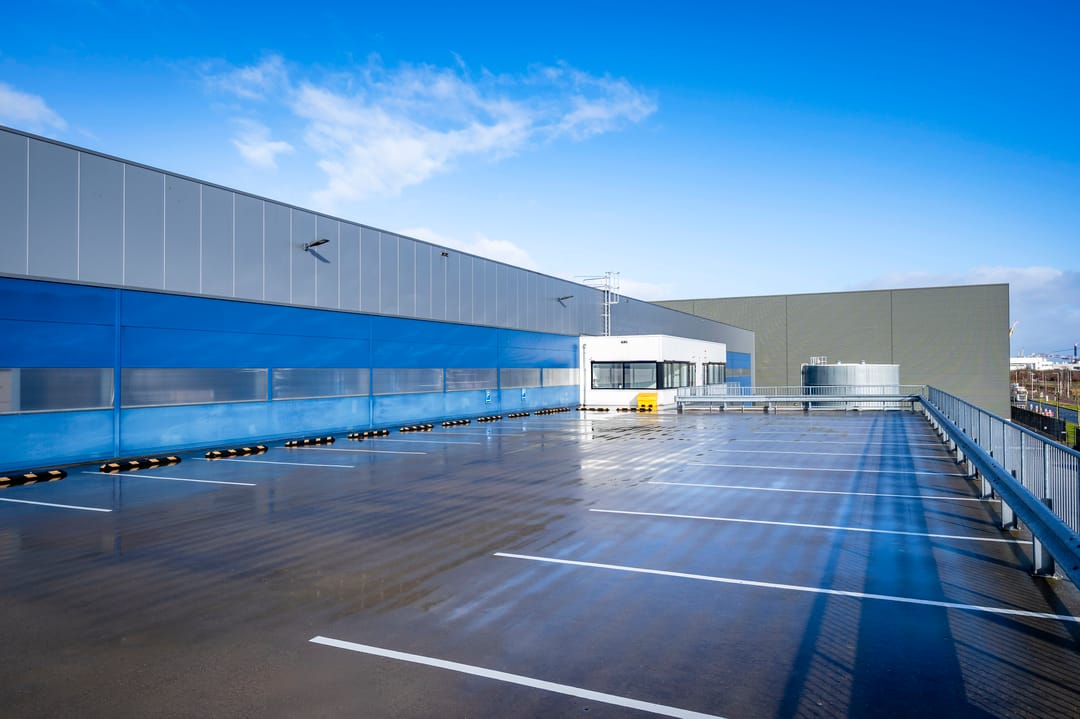 - Oppervlakken van gewapend beton voor de loading docks;