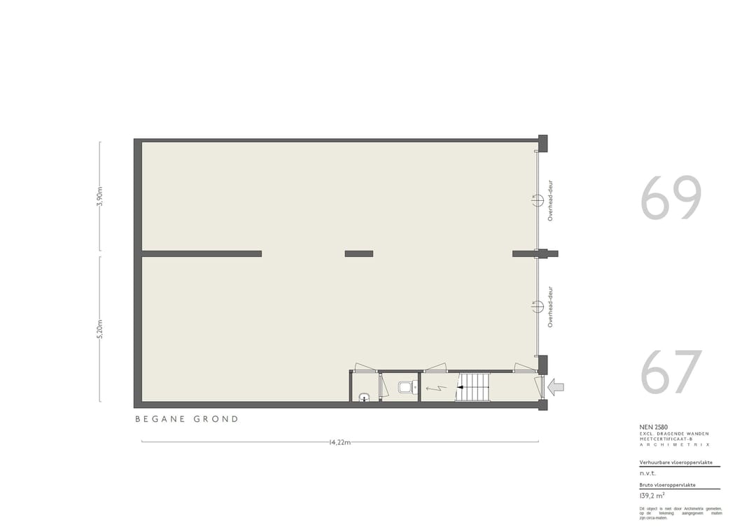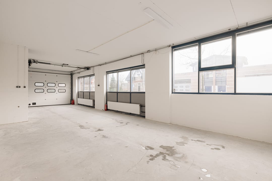 De begane grond leent zich uitstekend als bedrijfsruimte en is voorzien van twee overheaddeuren. De wanden zijn gestuct en wit geschilderd en de betonnen vloeren zijn glad afgewerkt. Dankzij de aanwezige sparingen ontstaat een open en ruimtelijke indeling.