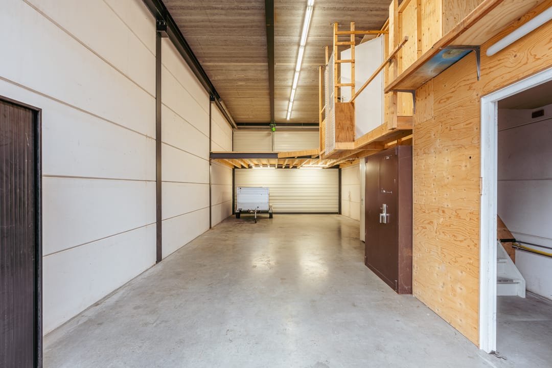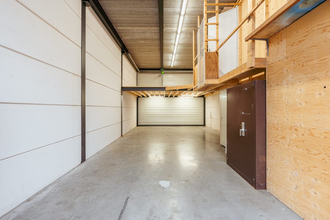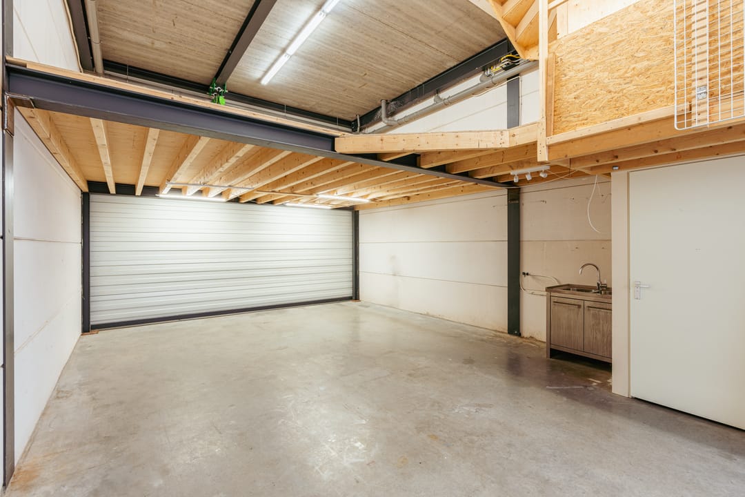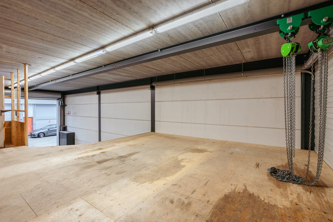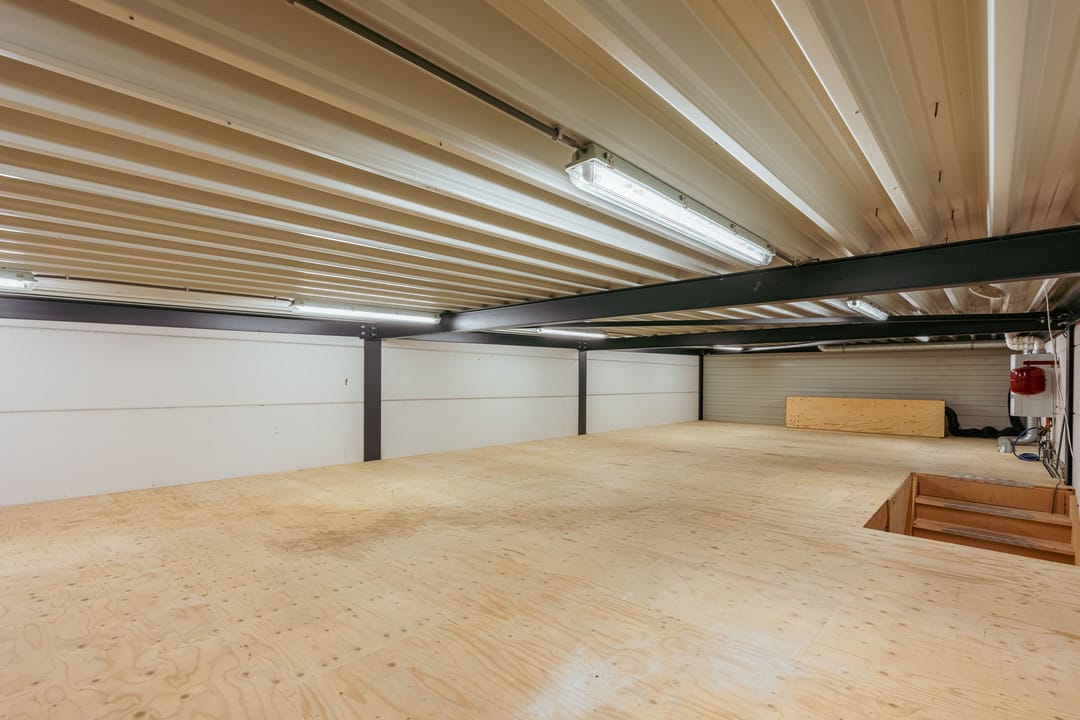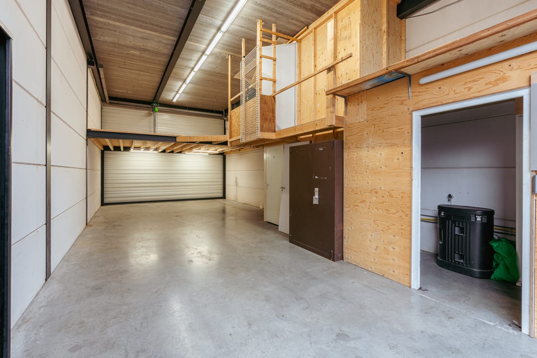 De bedrijfsruimte is ook bereikbaar via een overheaddeur en beschikt over een versterkte tussenvloer die zware belasting aankan.