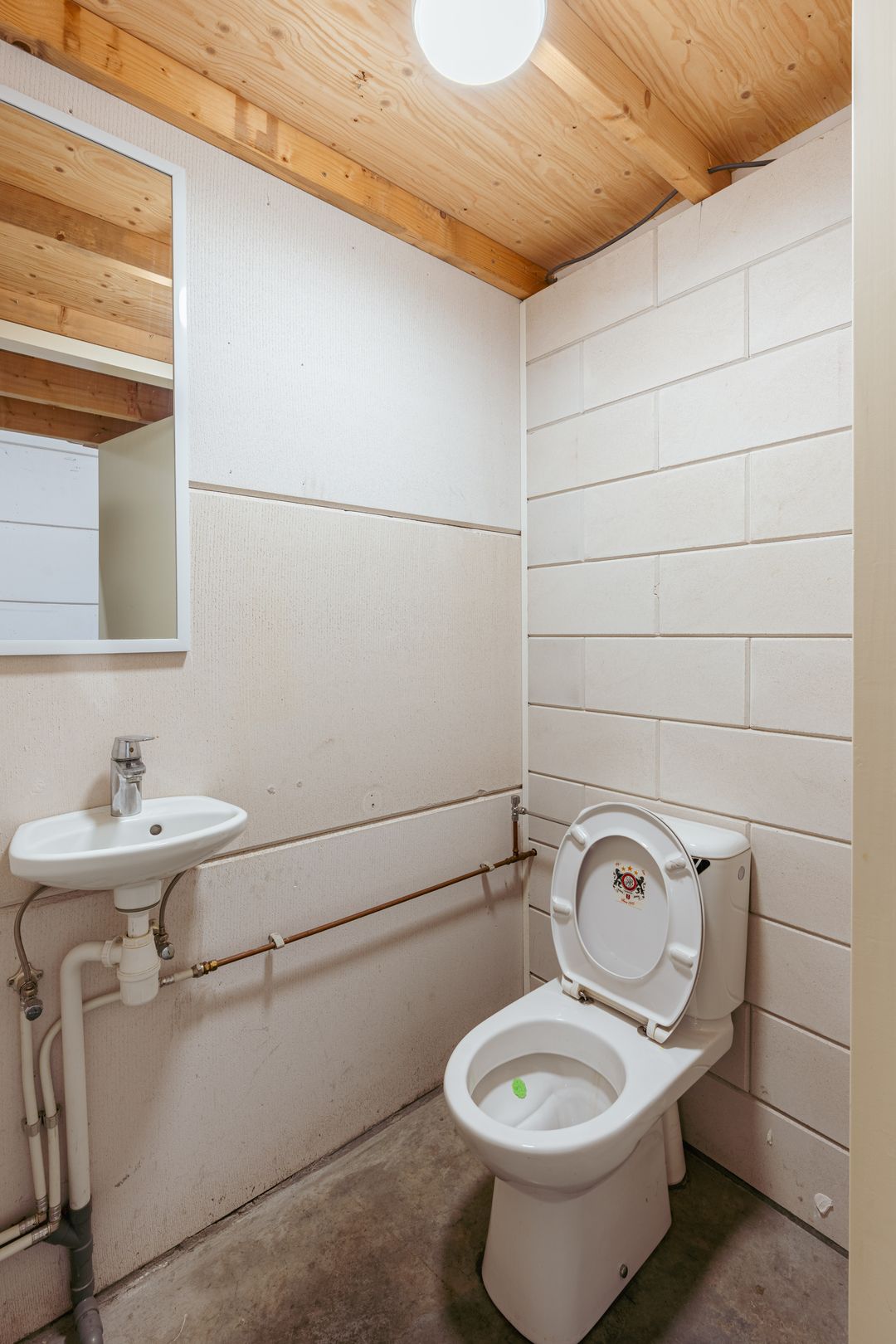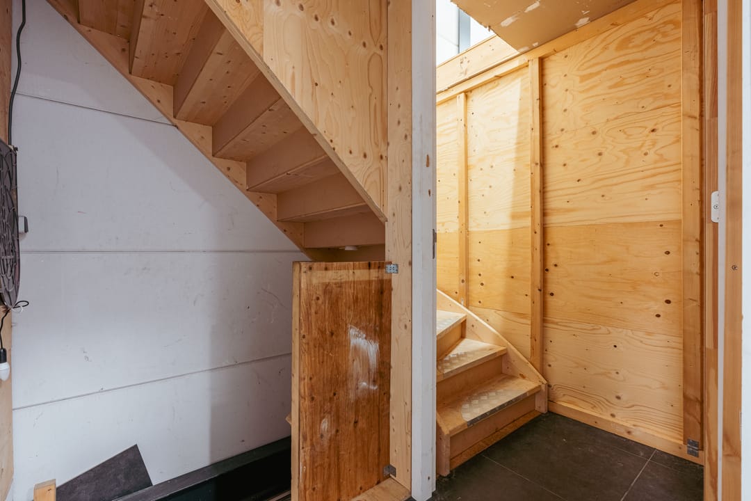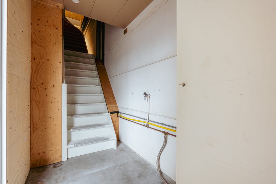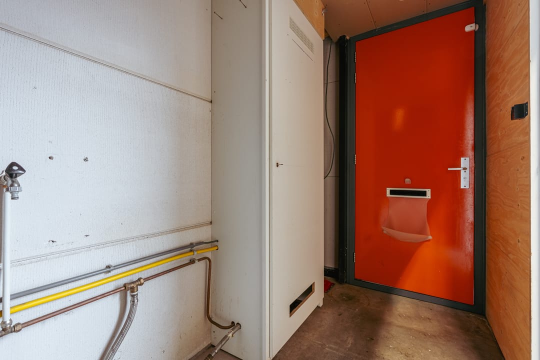 Aan het plafond is een H-balk gemonteerd zodat zware goederen eenvoudig kunnen worden verplaatst. Daarnaast vind je op de bagne grond een toilet en wastafeltje.