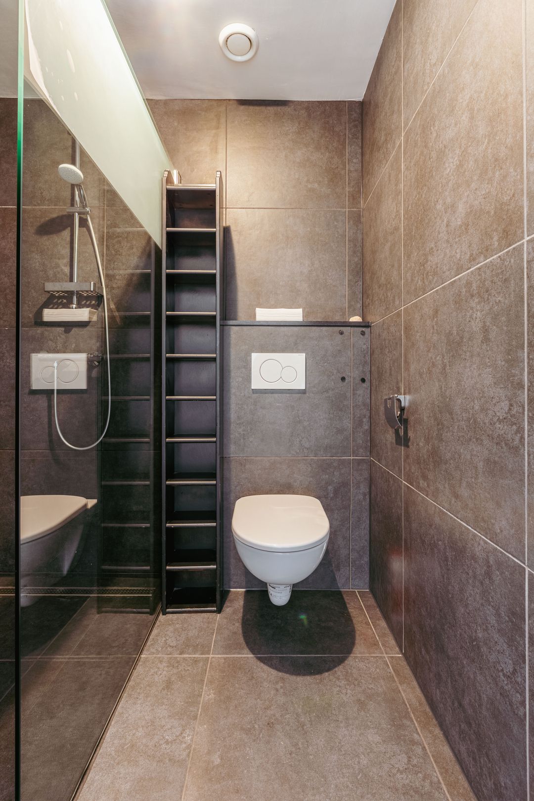 The stairs in the hall lead to the first floor, which houses a neat office space. This floor features a full tile floor with underfloor heating and a bathroom with a shower, sink, and toilet.