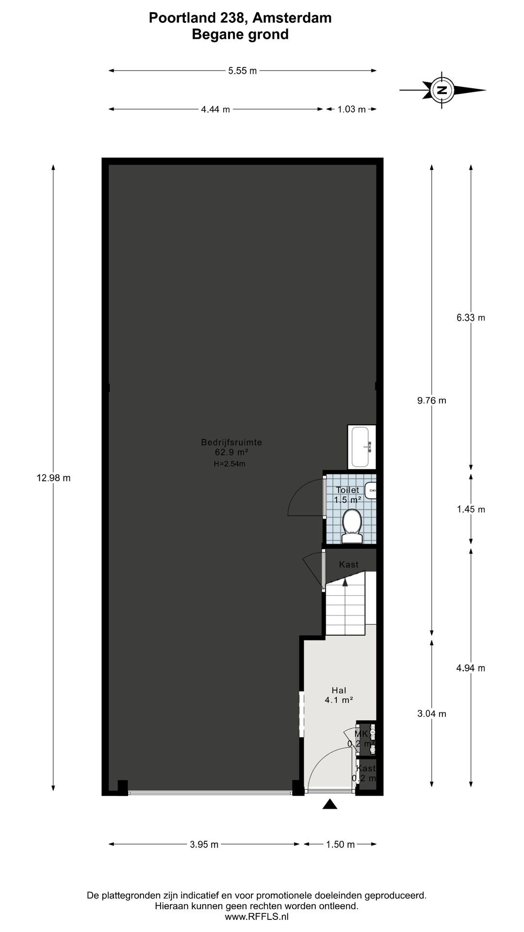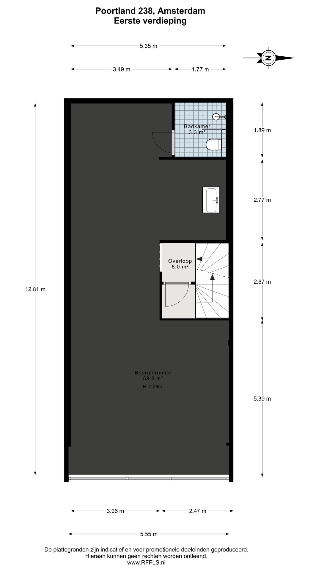De ruimte bestaat uit een bedrijfsruimte op de begane grond welke middels een overheaddeur toegankelijk is, een kantoorruimte op de 1e verdieping met vloerverwarming en badkamer, en een extra 2e verdieping met beperkte stahoogte die uitstekend als berging kan worden gebruikt.
