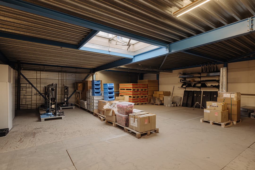 - Overheaddeuren, betonvloer, toilet, pantry, inbouwarmaturen en te openen ramen