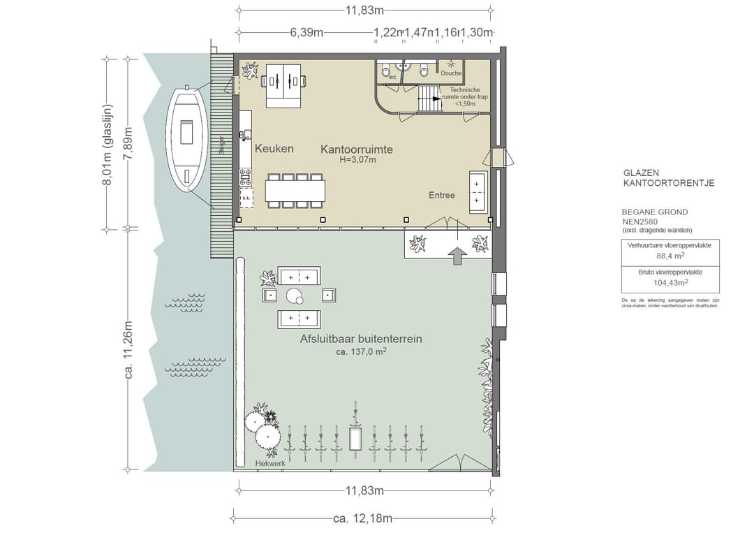 Bijzonder aan de kantoorruimte is de glazen voorzijde waardoor er uitzicht is op het groengebied. Aan de achterzijde bieden de ramen op de bovenste verdieping een fascinerend uitzicht over het IJ en Amsterdam. De bedrijfsruimte beschikt over een vrije hoogte van ruim 6 meter, grote entresolverdieping en overheaddeur.