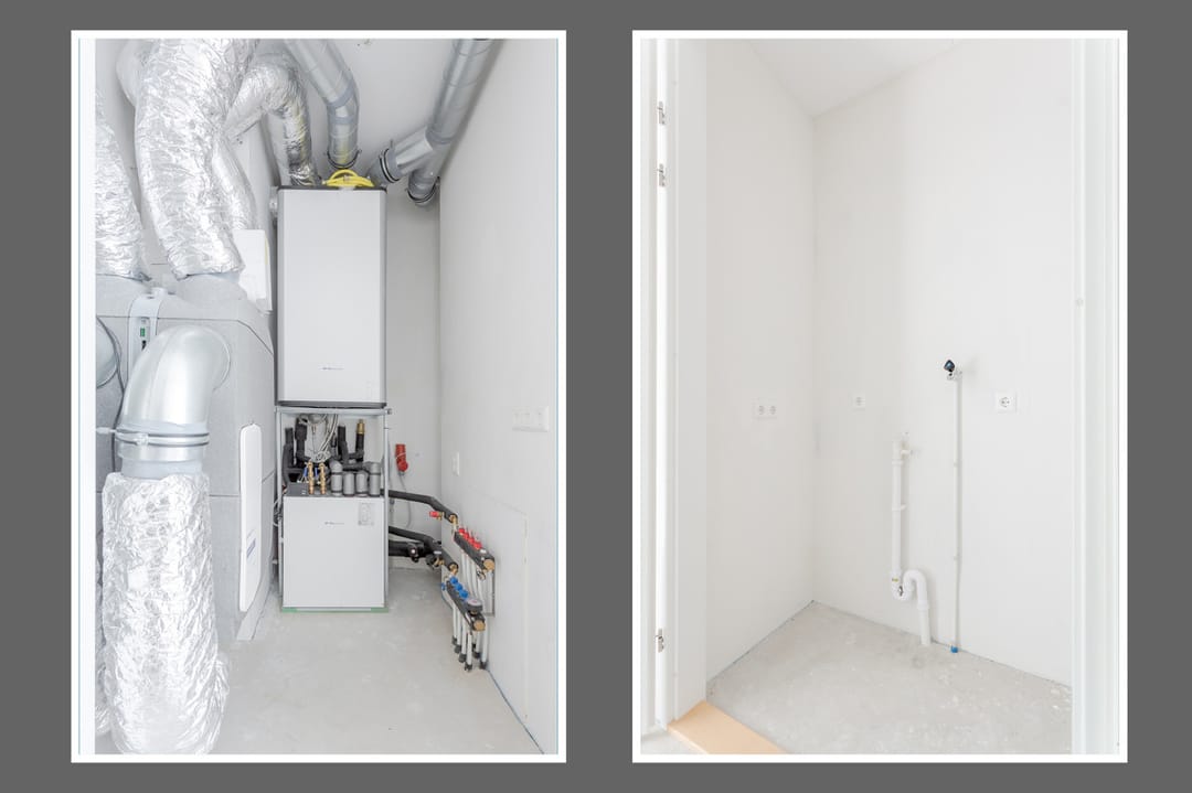 zuidwesten • Witte Bribus keuken in hoekopstelling, voorzien van zwart composietblad en inbouwapparatuur: inductiekookplaat, afzuigkap, vaatwasser, oven met geïntegreerde magnetron en koelvriescombinatie • Badkamer voorzien van douche met glazen douchedeur en wastafel • Apart toilet • Berging met opstelplaats voor wasmachine en droger en WTW • Vloerverwarming • Deur naar gekoppelde bedrijfsruimte met schuifpui naar buiten.