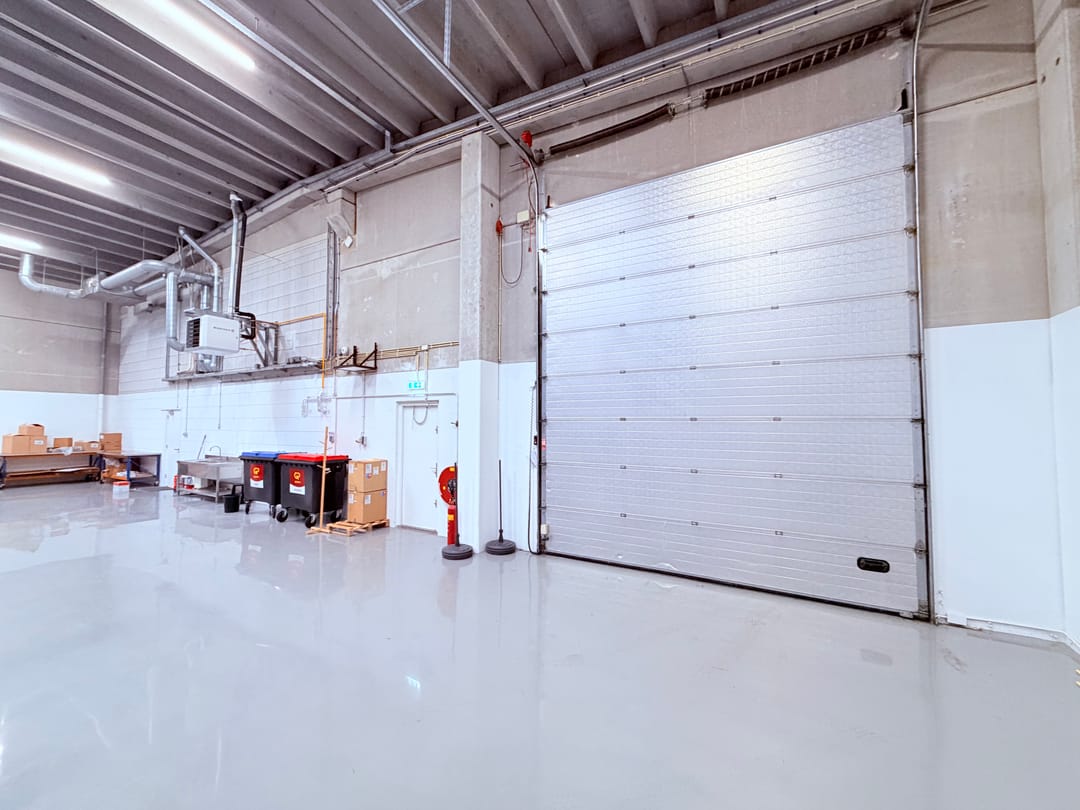 - Lichtstraten, overheaddeuren, krachtstroom, betonvloer, heater, toilet, pantry, mechanische ventilatie, topkoeling, inbouwarmaturen en te openen ramen